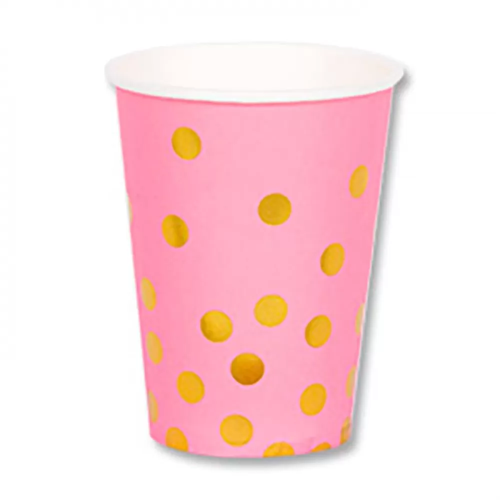 - В наборе 6 бумажных стаканов розового цвета с принтом золотой горошек.