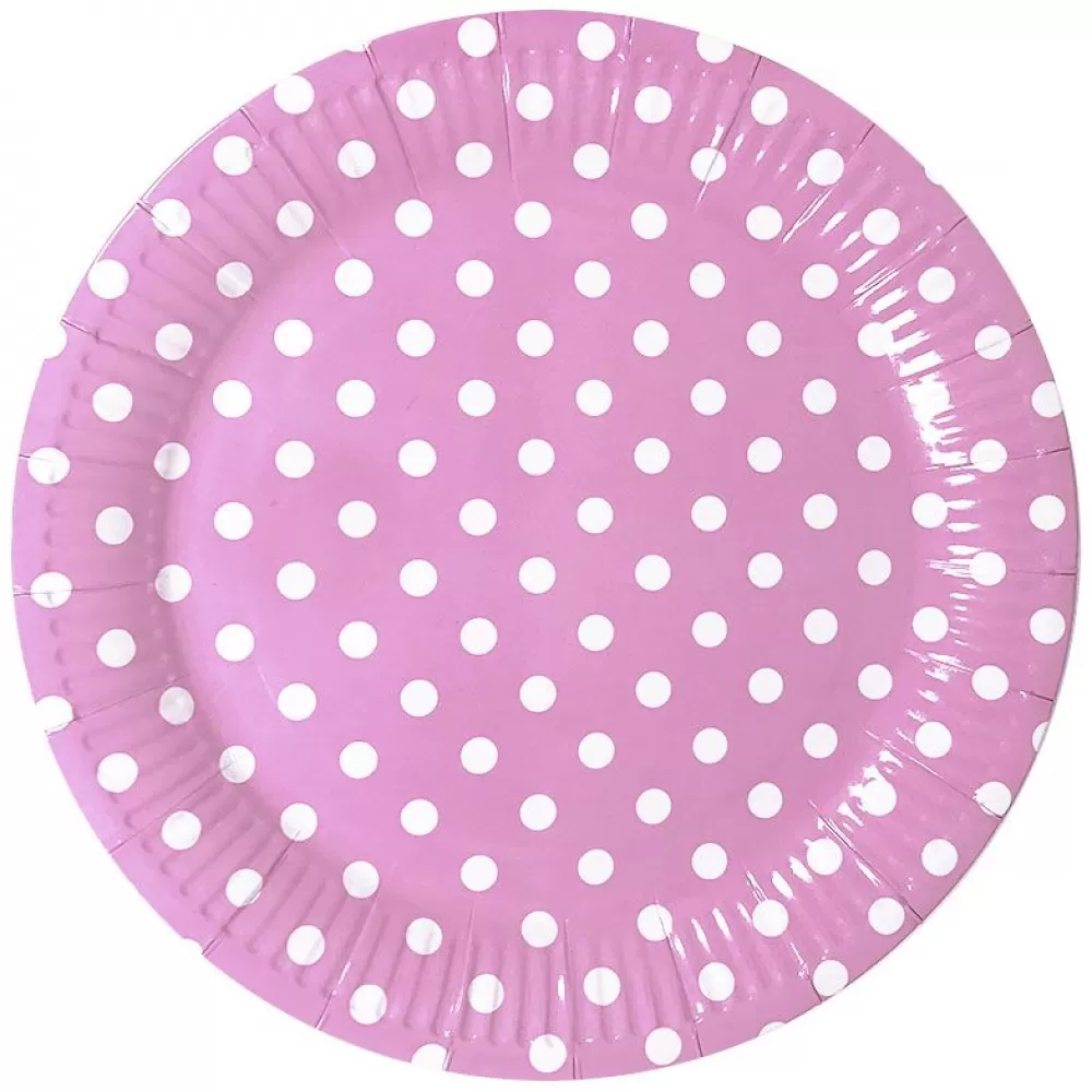 - Тарелки одноразовые розового цвета в белый горошек. В упаковке 6 ламинированных бумажных тарелок.