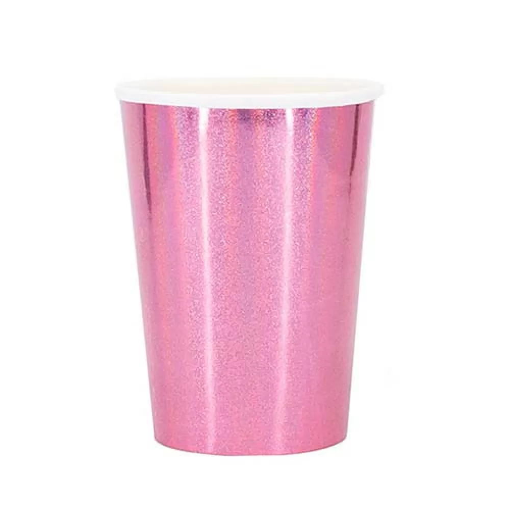 - Красивые бумажные розовые стаканы с голографическим блеском.