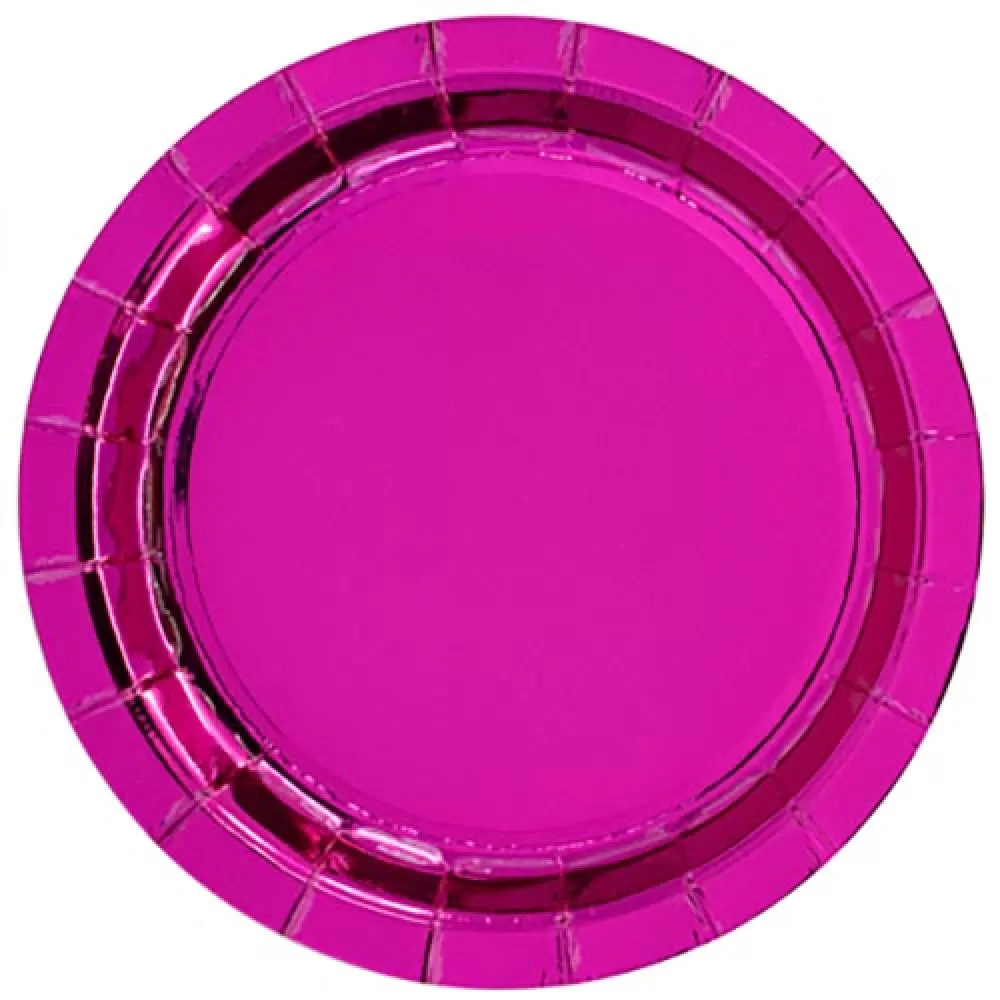 - Одноразовые бумажные ярко-розовые фольгированные тарелки. В упаковке 6 штук.