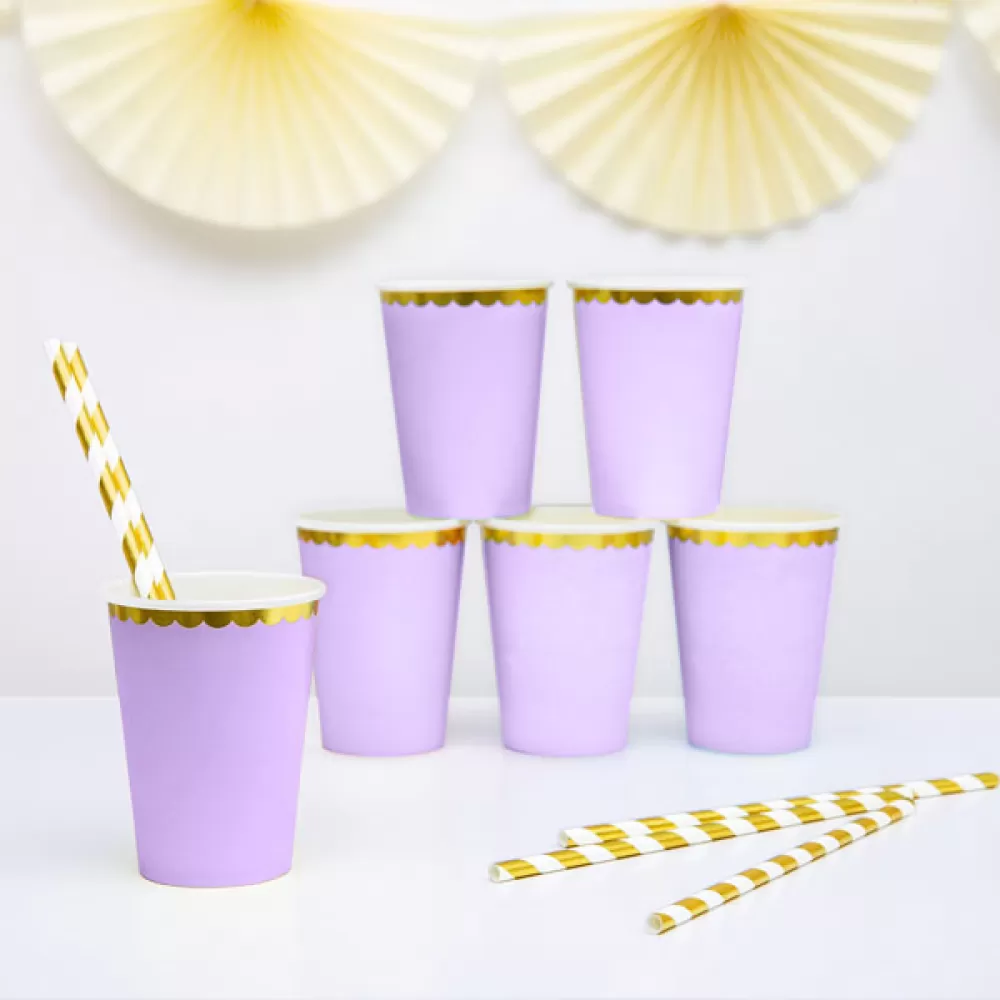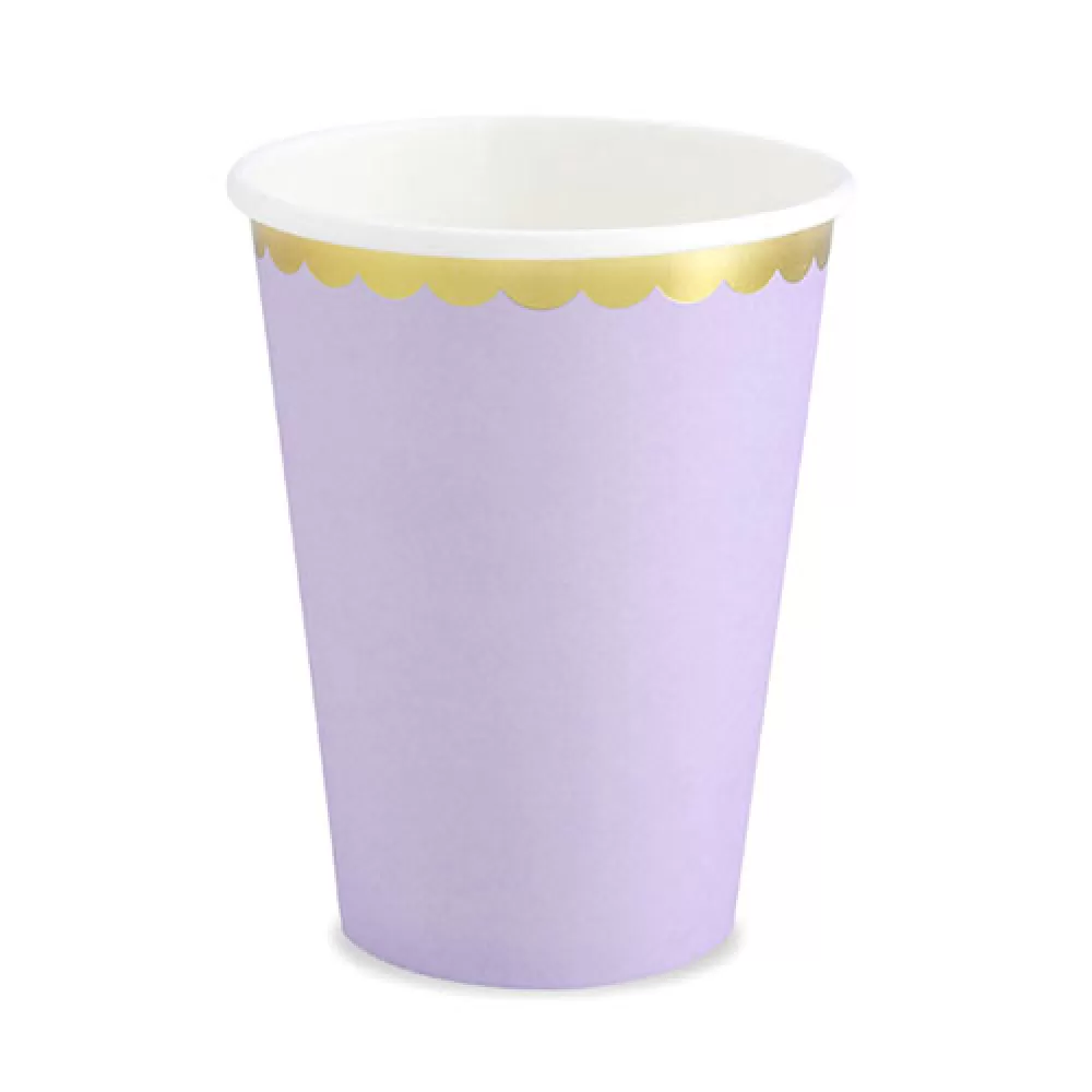 - В наборе 6 бумажных стаканов в нежного лилового цвета с золотыми фестонами по краю.