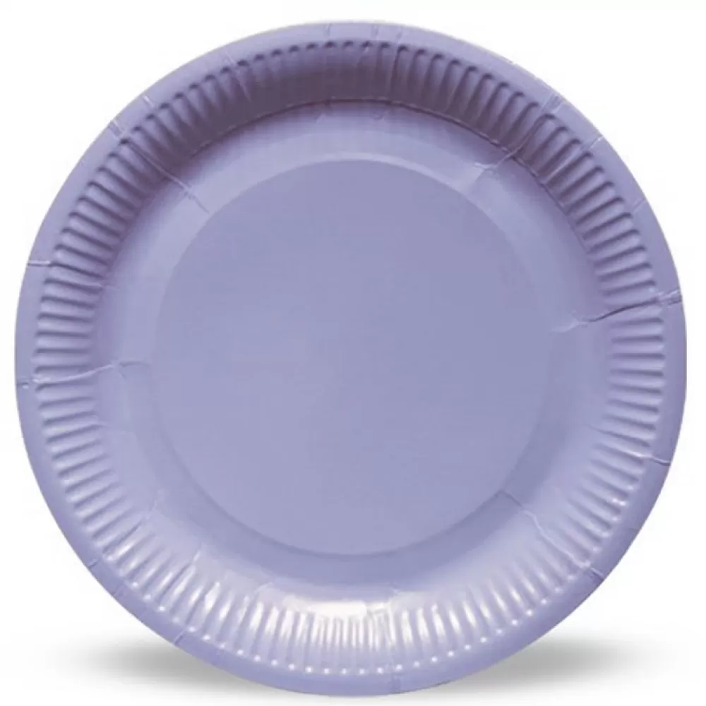 - Одноразовые бумажные тарелки сиреневого цвета. В наборе 8 бумажных ламинированных тарелок диаметром 17 см.