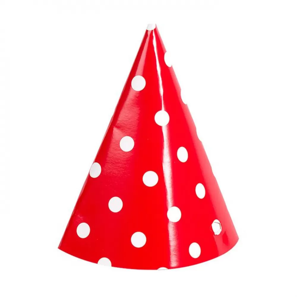 - В наборе 6 бумажных красных колпачков в белый горошек.