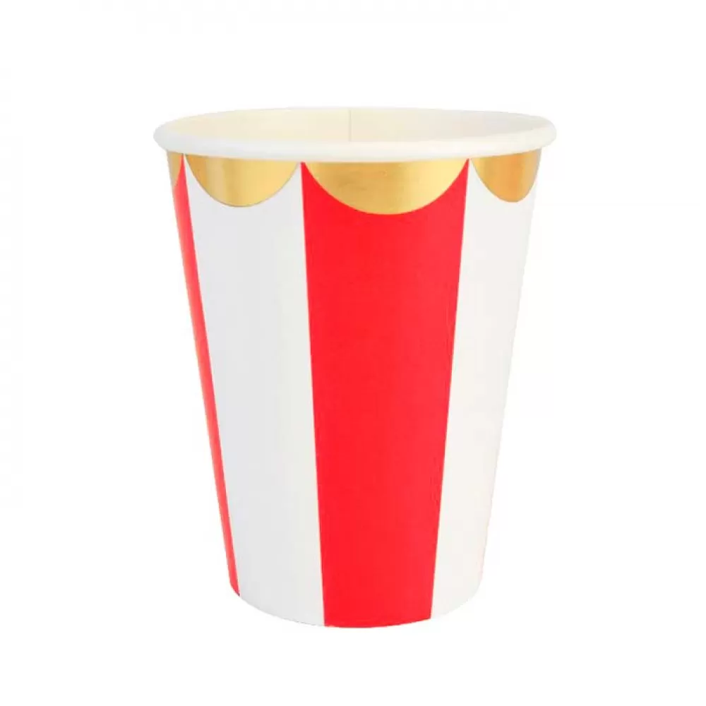 - В наборе 6 бумажных стаканов в бело-красную полоску с золотыми фестонами.