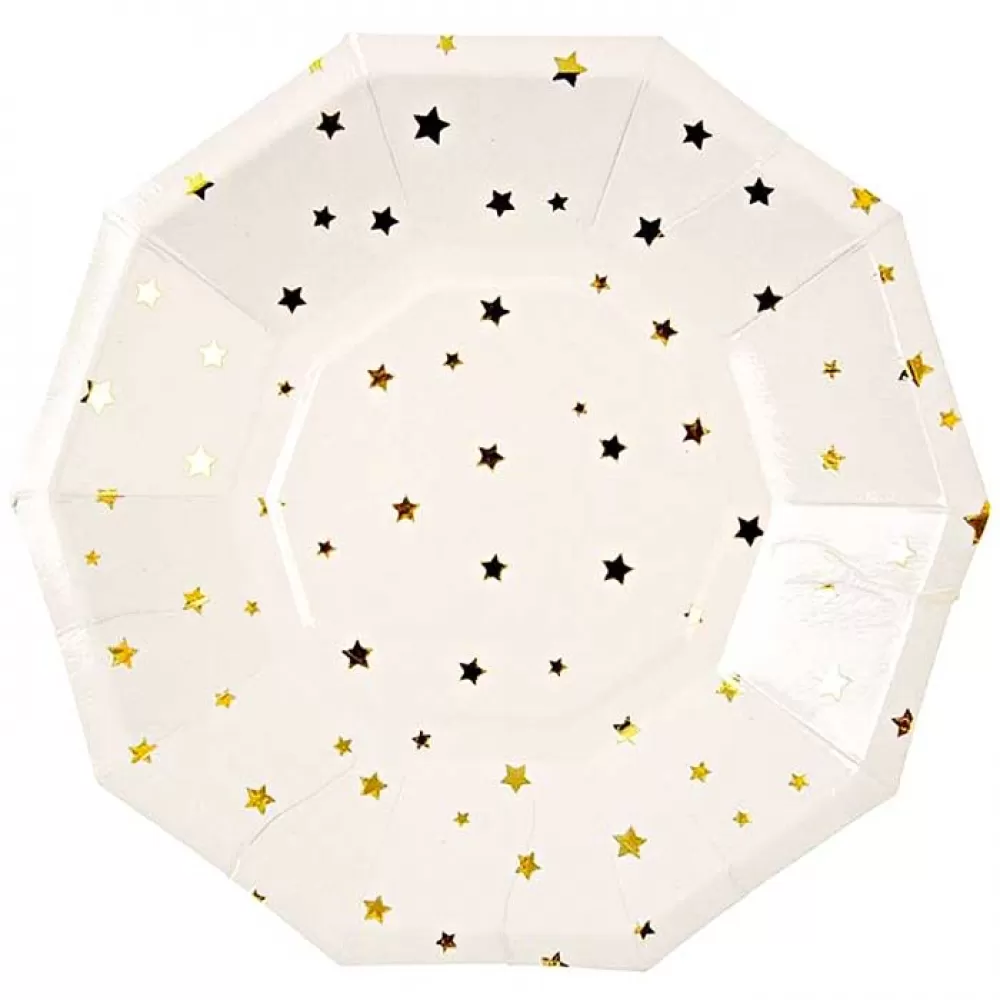 - Тарелки одноразовые бумажные белого цвета с золотыми фольгированными звездами. В упаковке 6 фигурных ламинированных тарелок.