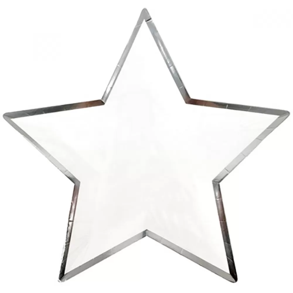 - Фигурные бумажные тарелки в форме звезды, белые с серебристым кантом.