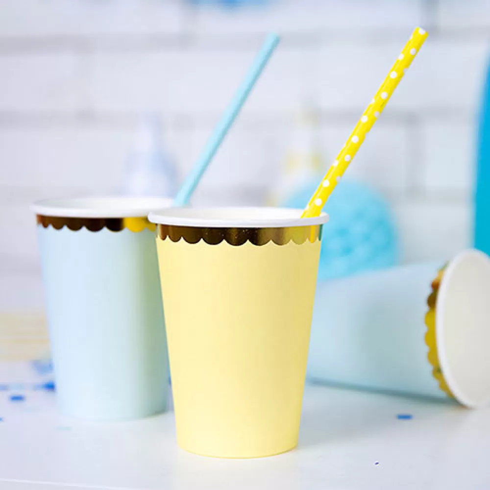 - В наборе 6 бумажных стаканов в нежного желтого цвета с золотыми фестонами.