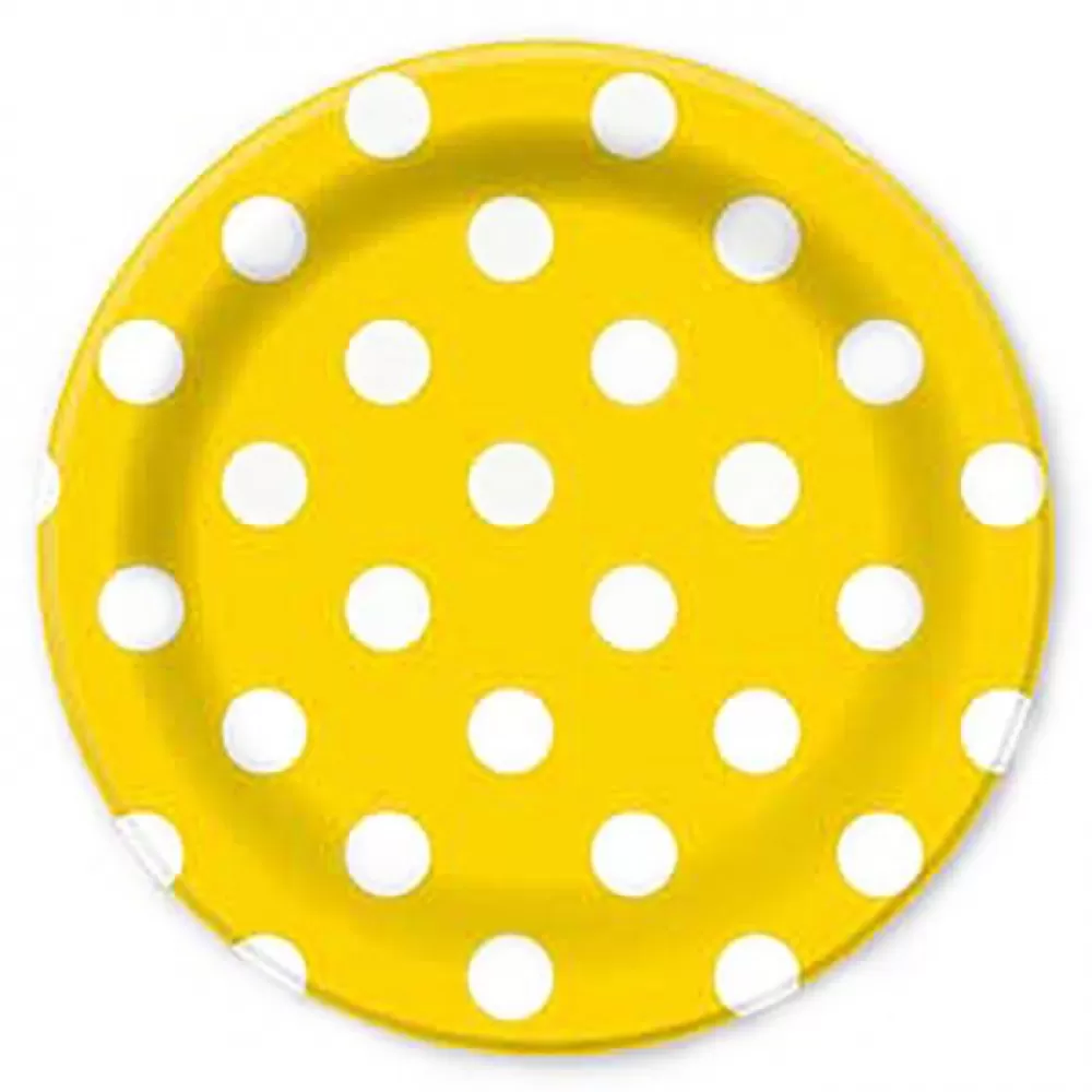 - Одноразовые бумажные тарелки желтого цвета в белый горошек. В упаковке 6 ламинированных тарелок для праздничного стола.