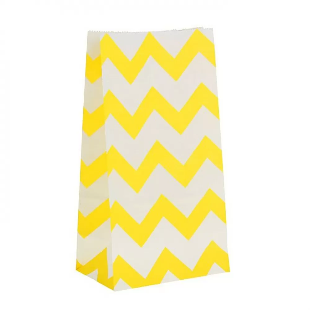 - Бумажный фасовочный пакет с желтым рисунком шеврон, размер 24х13х8 см.