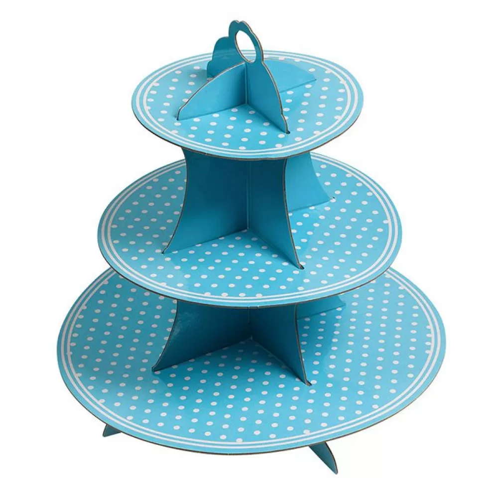 - Яркая трехъярусная стойка Голубой горошек для эффектной сервировки десертов, капкейков или других сладостей из плотного ламинированного картона.