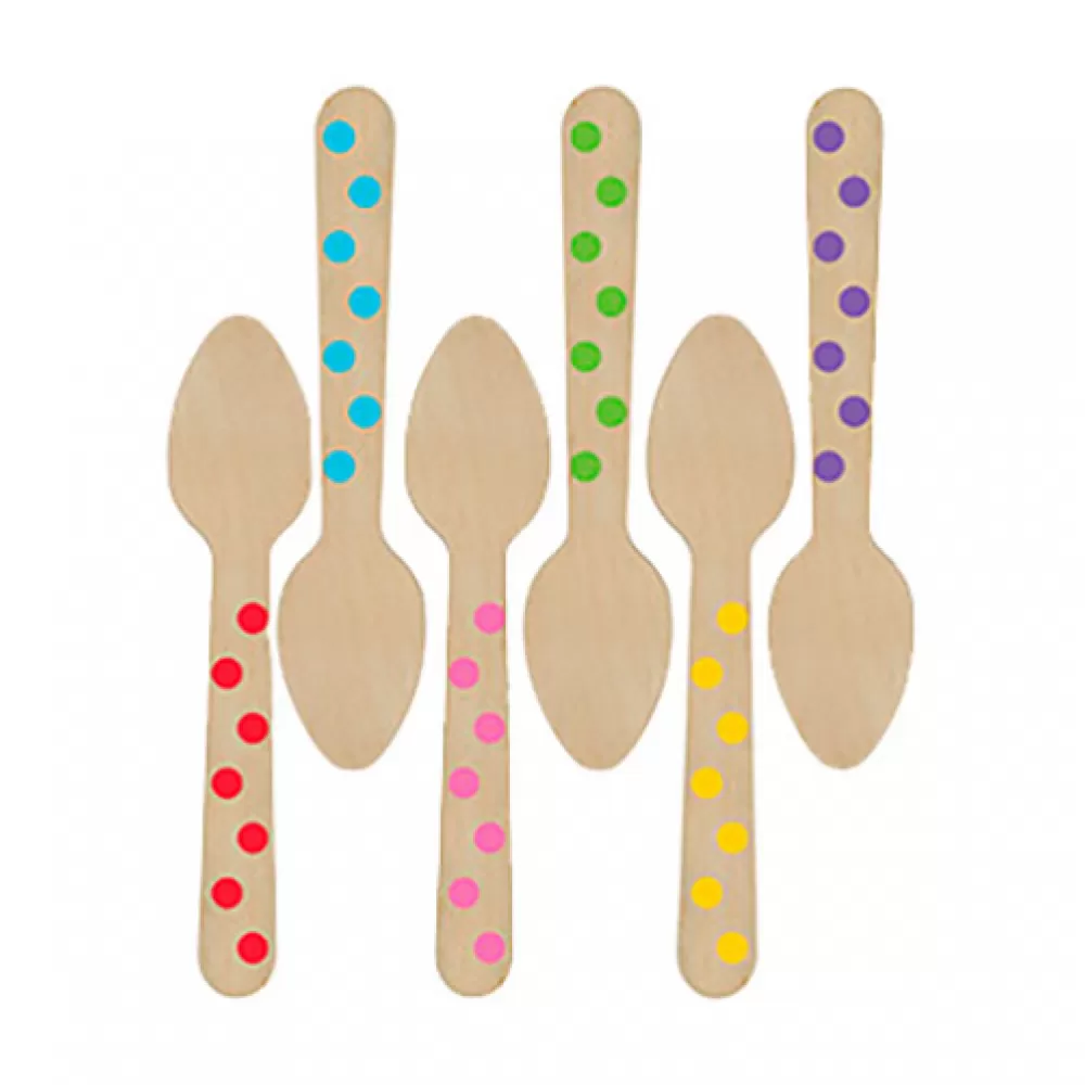 В наборе 12 мини-ложек из дерева в горошек разного цвета.