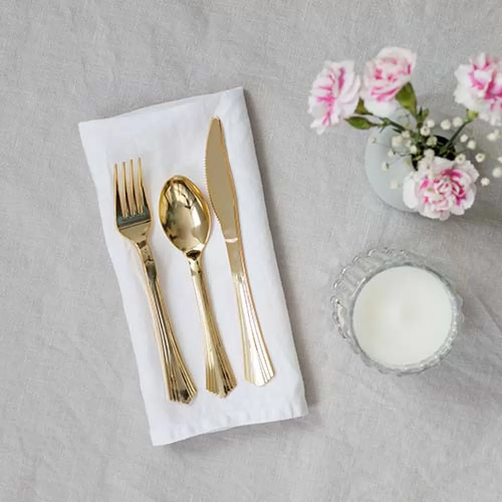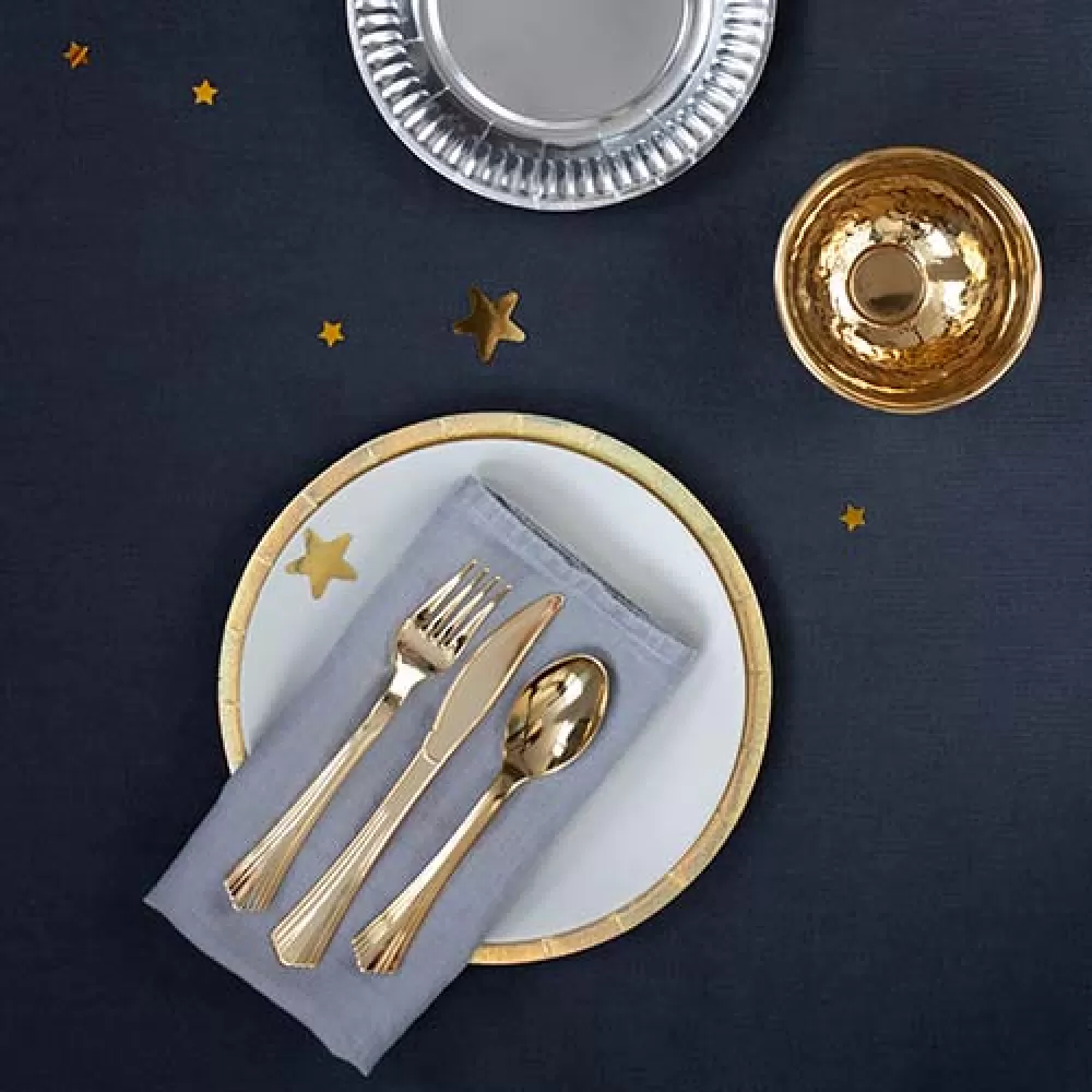 - Эстетичные золотые одноразовые столовые приборы отлично подойдут для множества детских тематик и для взрослых праздников. Приборы отлично выглядят и неотличимы от металлических. Пока не возьмешь эти столовые приборы в руку, не понятно, что это пластик.