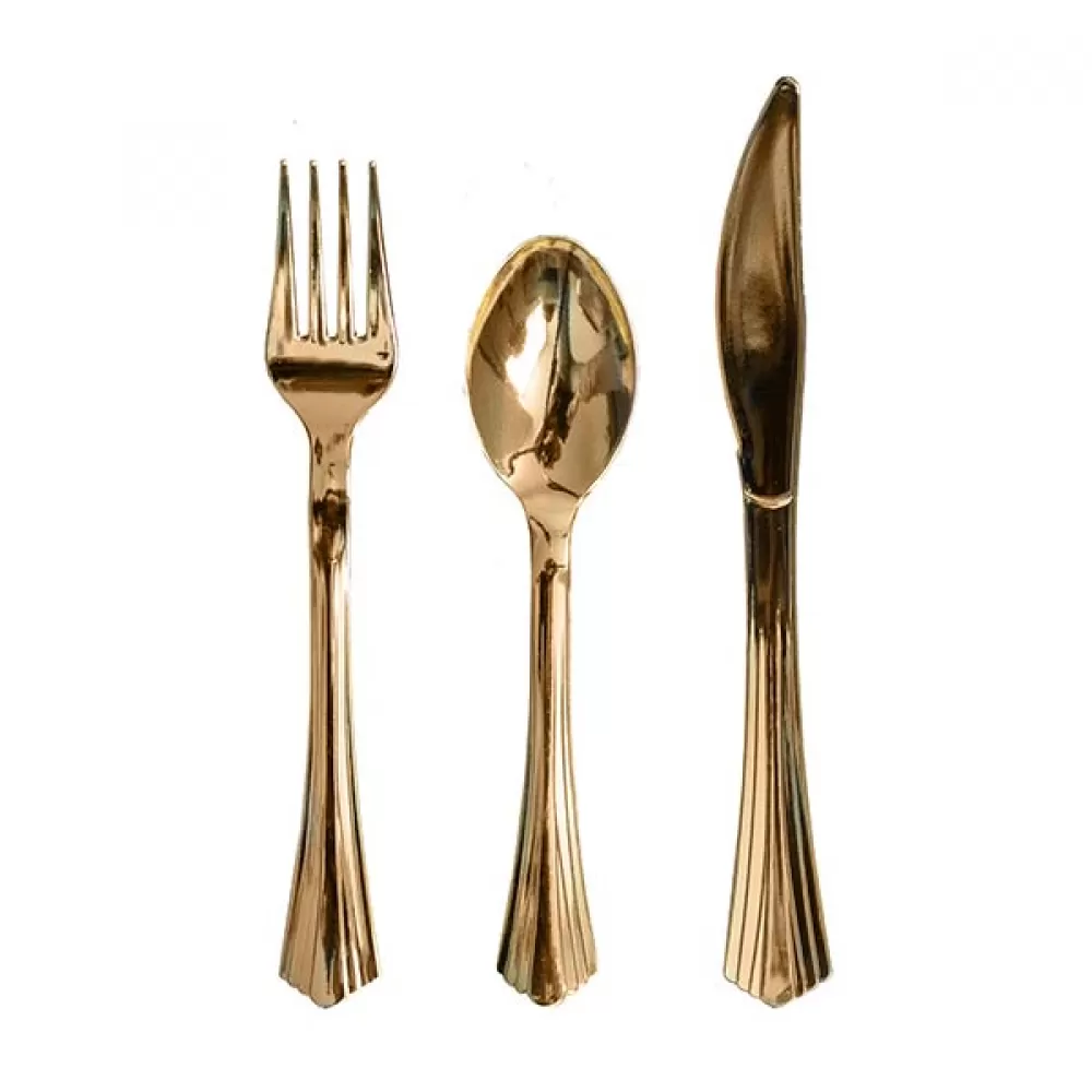 - Золотые одноразовые столовые приборы, в наборе 18 пластиковых столовых приборов золотого цвета (вилки, ножи и ложки по 6 шт.)
