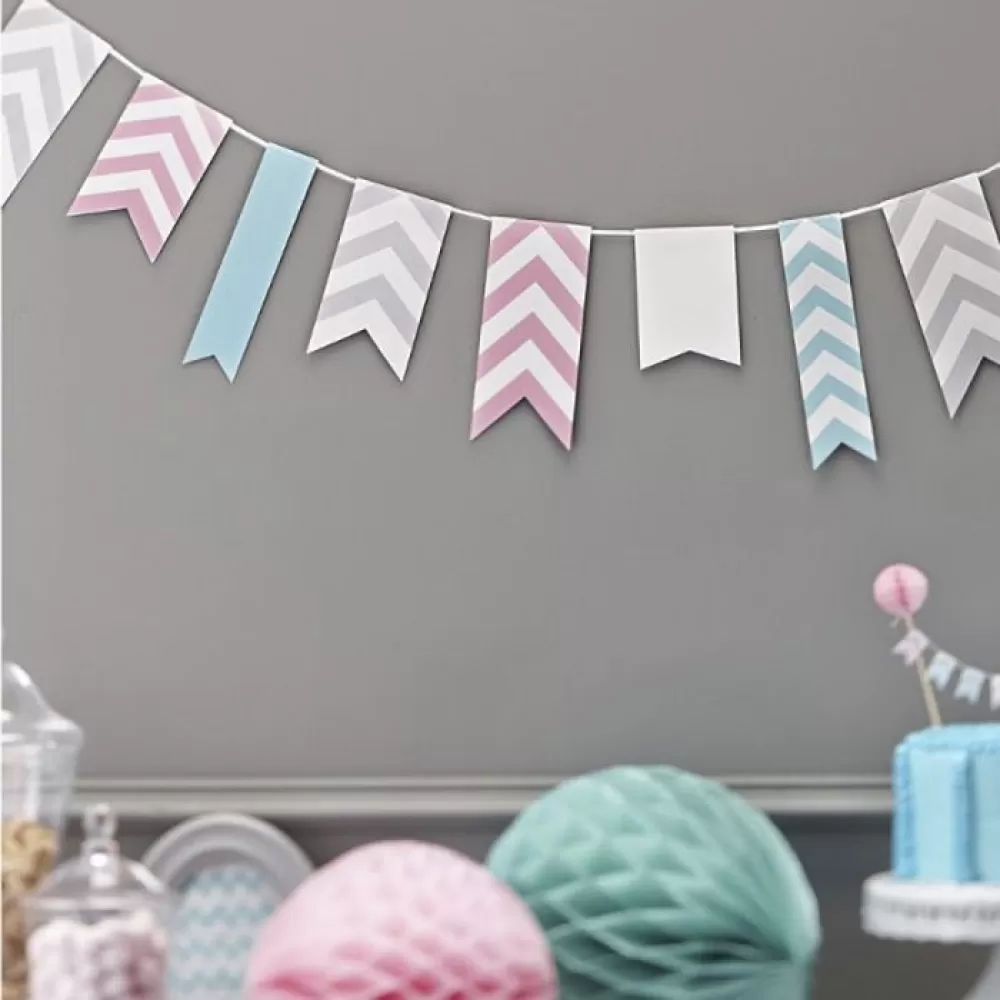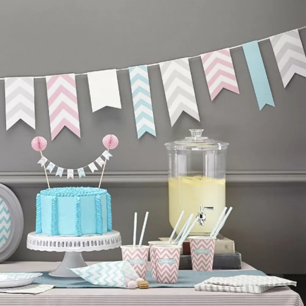 - Цвета флажков пастельных оттенков - розовый, серый, бежевый, бирюзовый и мято-зеленый. Принт на одной стороне флажка.