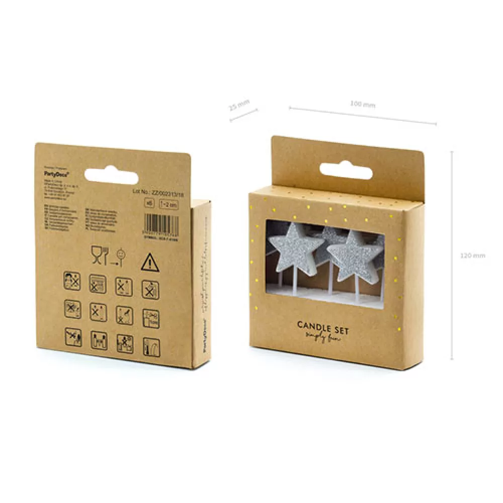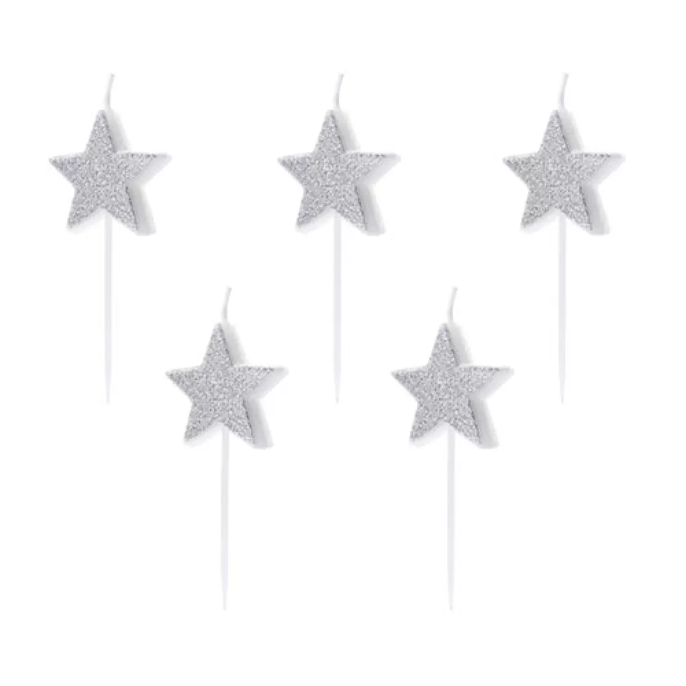 - В наборе 5 серебряных свечей-звездочек на шпажках.