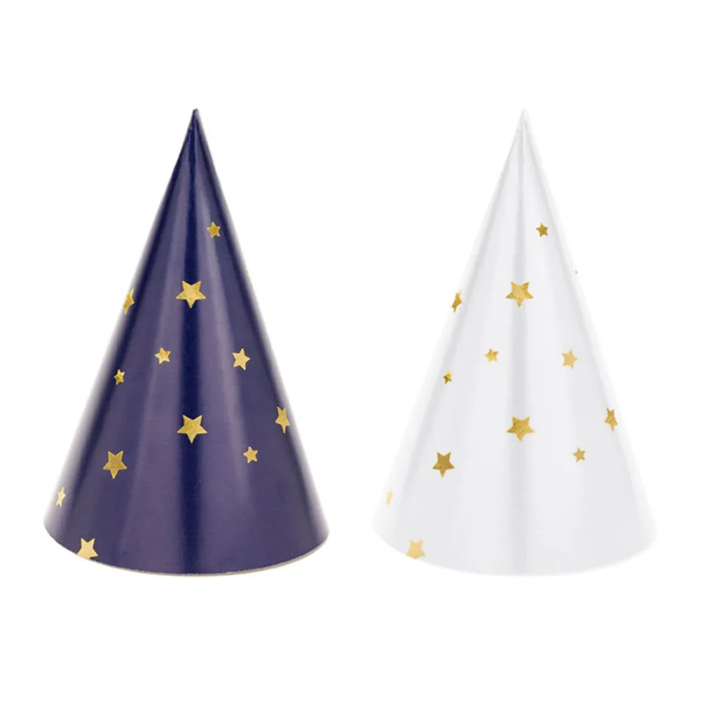 В наборе 6 маленьких бумажных колпачков «Космос», 3 белых с золотыми звездами и 3 синих с золотыми звездами.