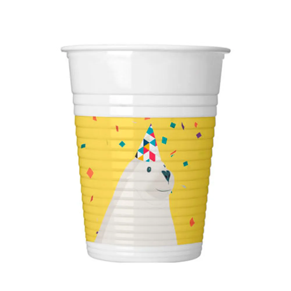 - В упаковке 8 пластиковых стаканов с моржом в праздничном колпачке для классной арктической вечеринки.