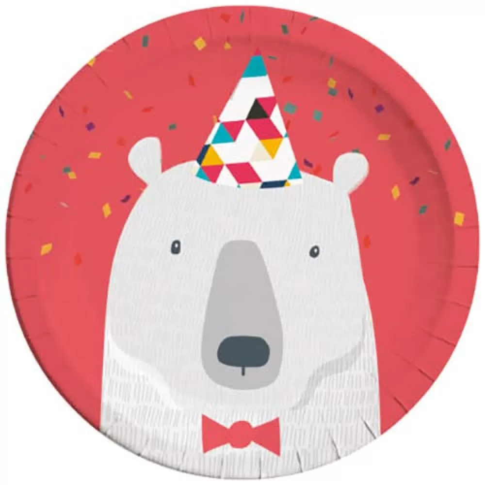 - В упаковке 8 больших ламинированных бумажных тарелок с белым медведем в праздничном колпачке на ярком красном фоне.