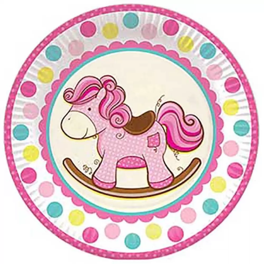- Одноразовые тарелки Лошадка для праздника малышки, в упаковке 6 ламинированных тарелок с лошадкой в розовых тонах.