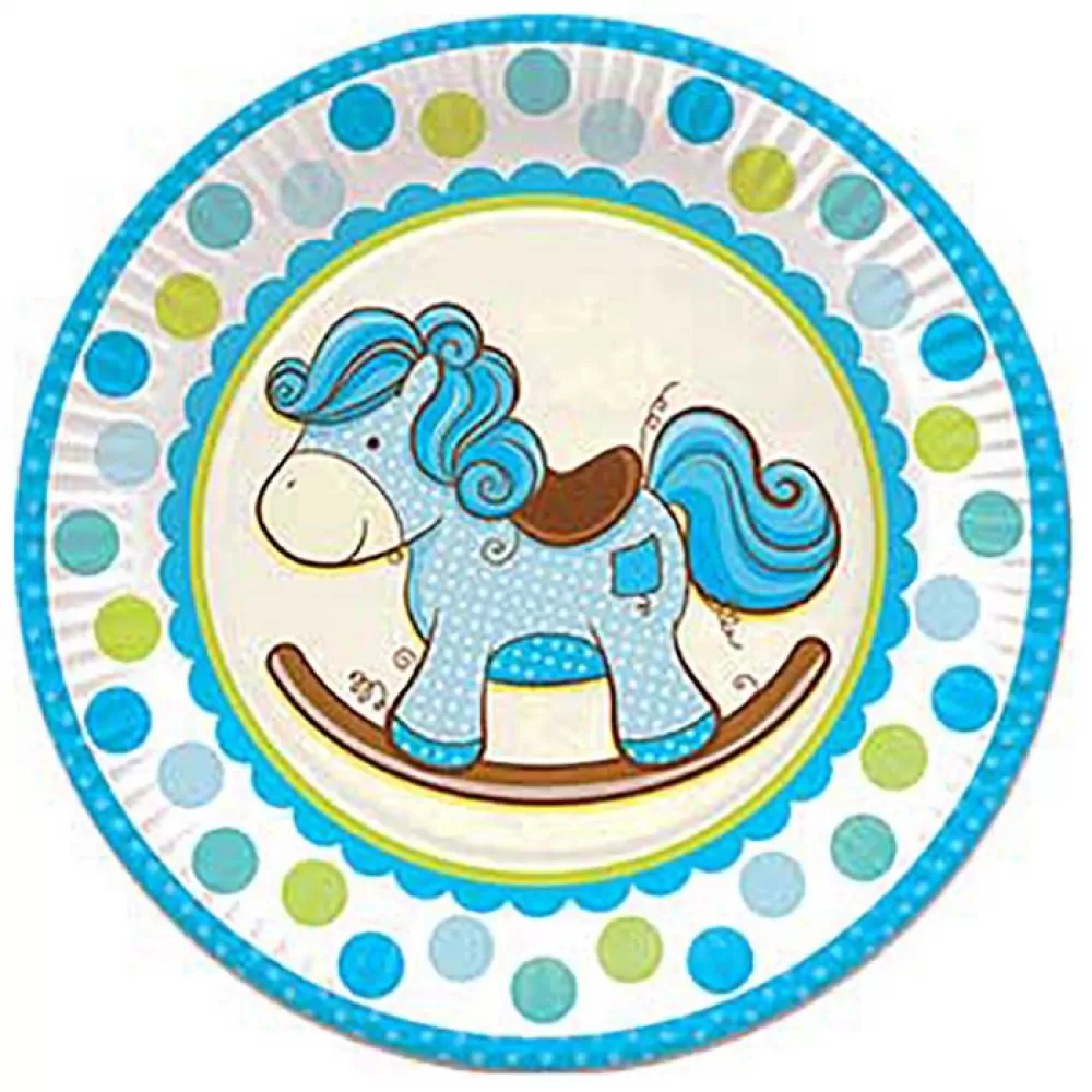 - Одноразовые бумажные тарелки для первого праздника. В упаковке 6 ламинированных тарелок с лошадкой в голубых тонах.