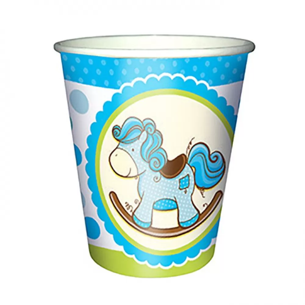 - В наборе 6 бумажных стаканов с лошадкой в голубых тонах.
