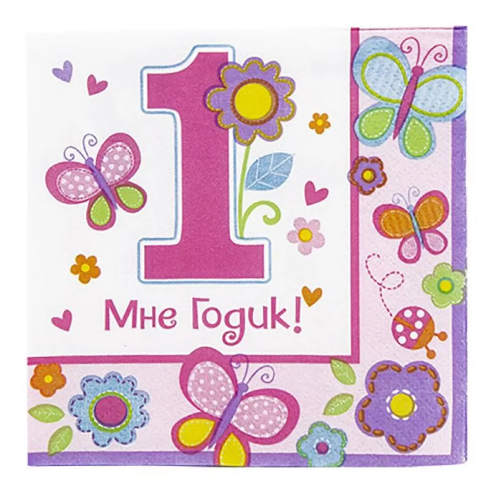 - Маленькие салфетки для первого праздника девочки c надписью «Мне годик!» и цифрой 1 из коллекции Sweet Girl.