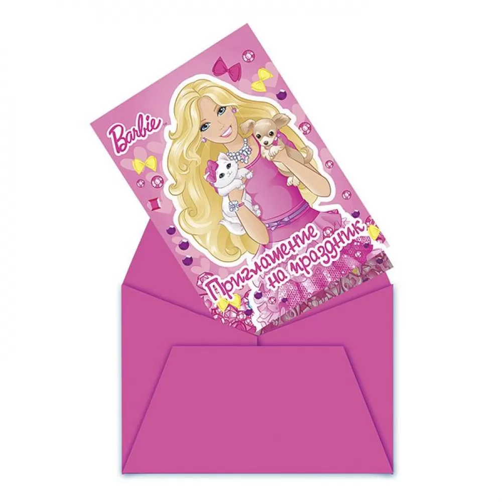 - Приглашения на праздник «Барби», в наборе 6 красочных приглашений в конвертах.