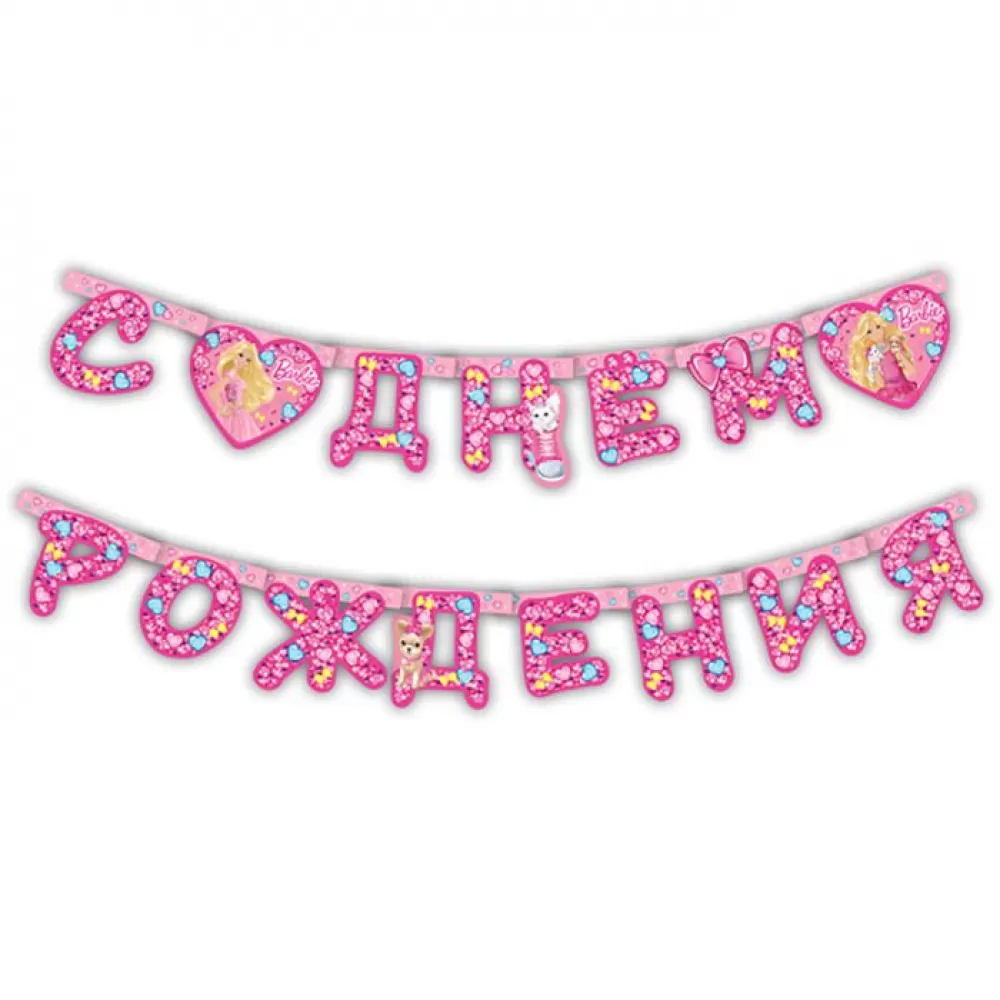 - Гирлянда «Барби» C Днем Рождения из бумаги, длина гирлянды 2,5 м, высота флажков 14 см.