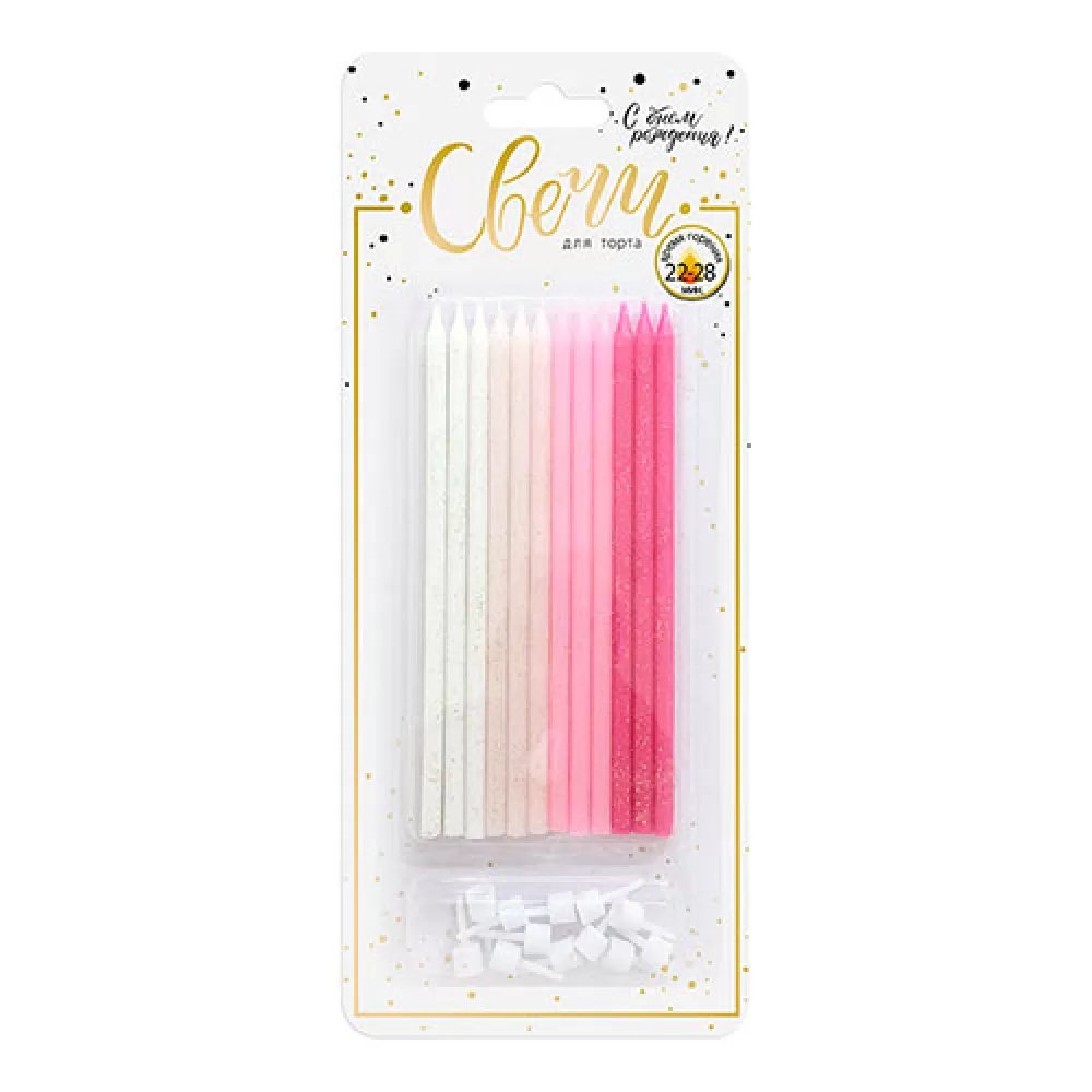 - В наборе 12 свечей: розовые, нежно-розовые, персиковые и белые с золотистыми блестками с держателями.