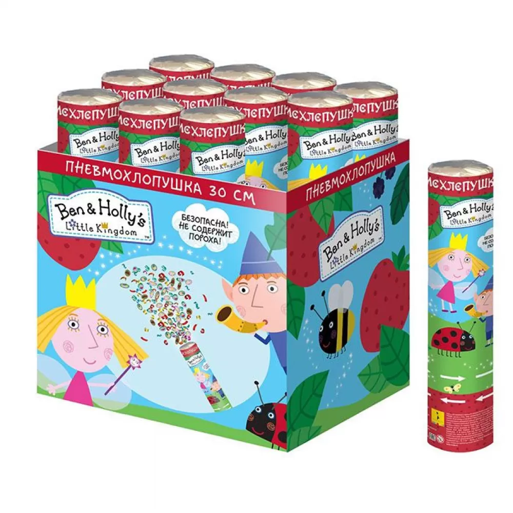 - Пневмохлопушка «Бен и Холли» высотой 30 см, наполнение - конфетти круглой формы с изображением героев мультфильма «Маленькое королевство Бена и Холли».