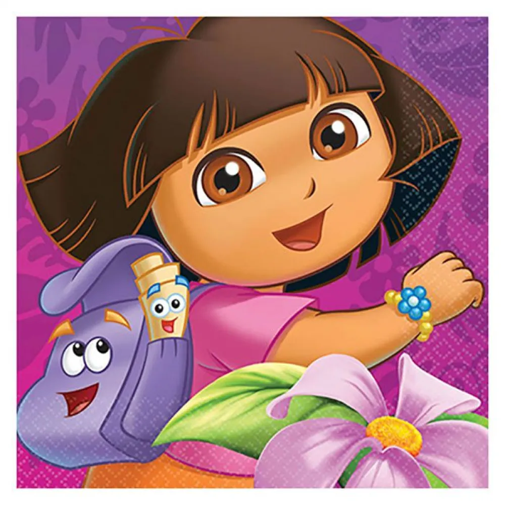 - Яркие бумажные салфетки с Дашей-путешественницей, Рюкзачком и Башмачком.Вперед, навстречу приключениям!