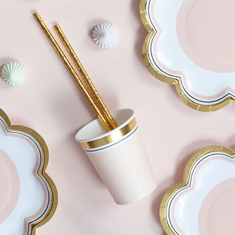 - Стаканы пастельного цвета с золотом с фигурными цветочными тарелками - отличный вариант для эффектной сервировки праздничного стола по любому случаю. Цветочный дизайн отлично подойдет для дня рождения девочки, взрослого праздника, baby shower, пикника или для пасхальной вечеринки.
