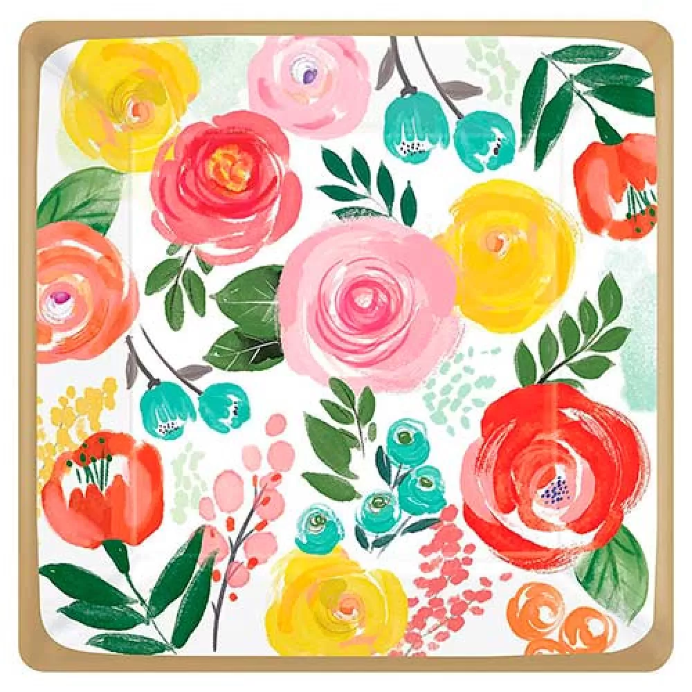 - Тарелки одноразовые Цветочный вальс, в упаковке 8 бумажных квадратных тарелок с цветочным принтом.