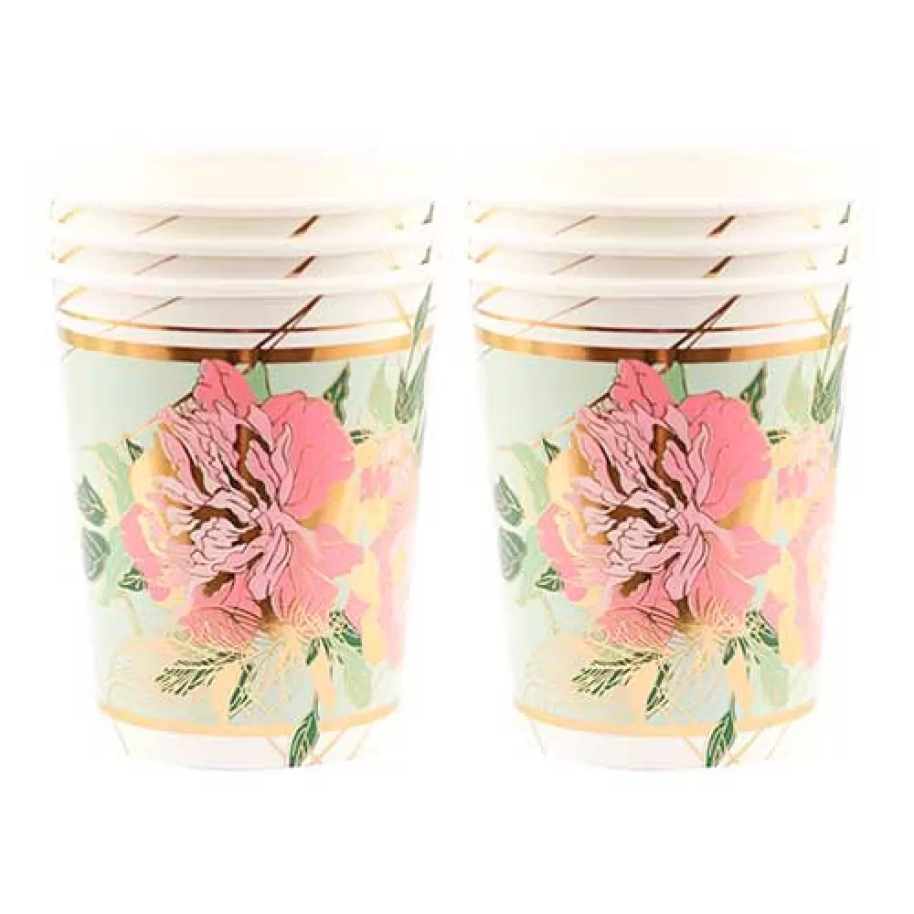- Бумажные стаканы Пионы с цветочным принтом и фольгированной золотой отделкой по краю.