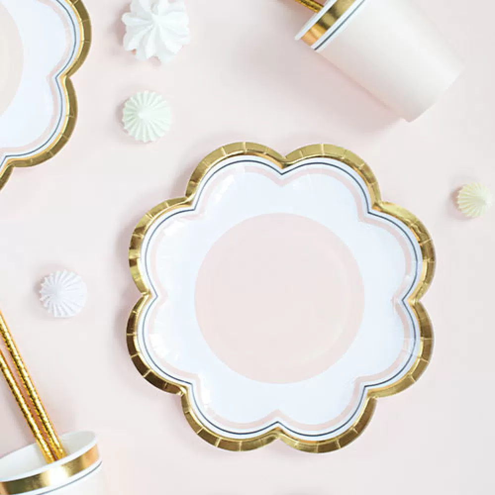 - Тарелки одноразовые бумажные Цветы, в упаковке 6 фигурных тарелок нежно-розового цвета с золотой каймой в форме цветка.