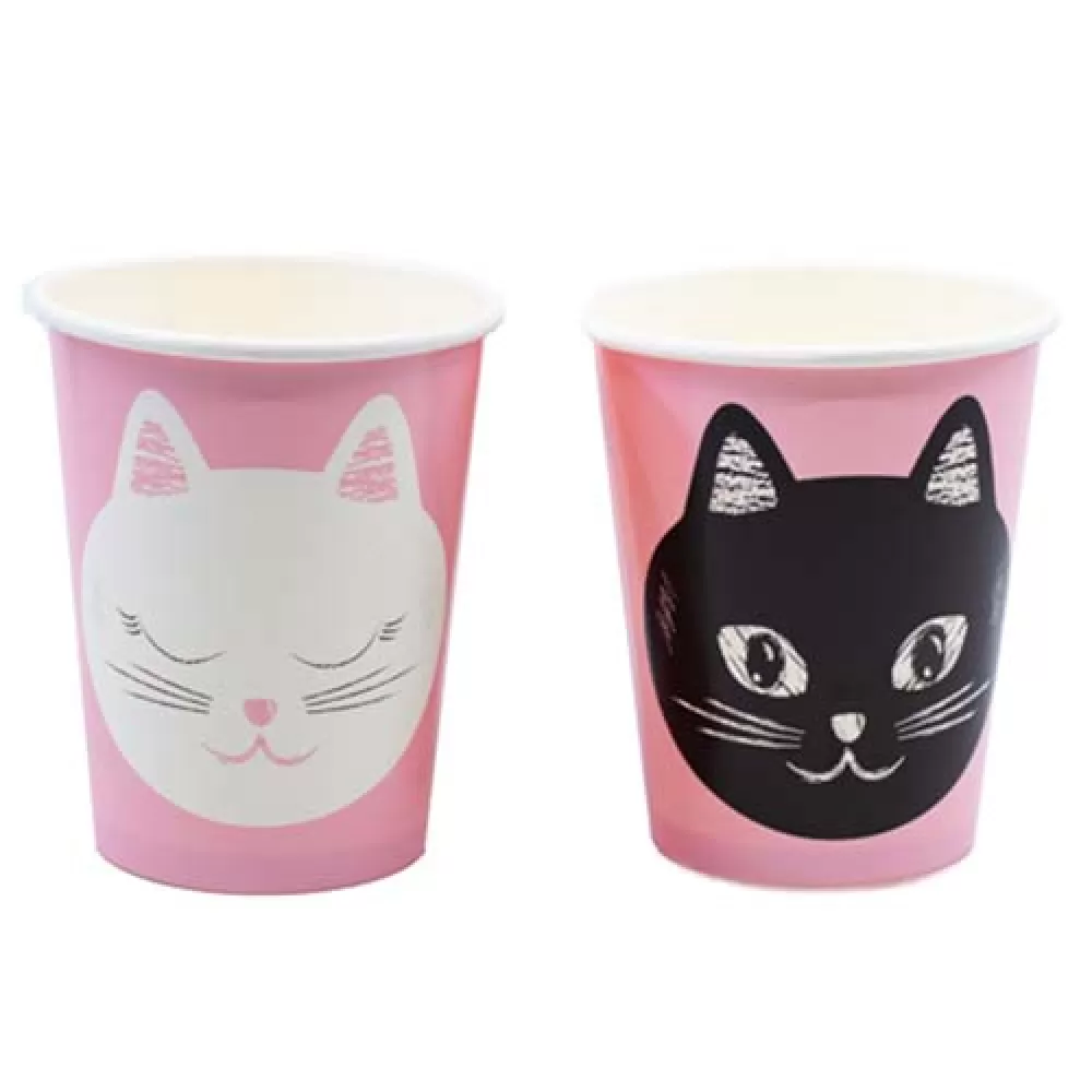 - Одноразовые бумажные стаканы Котики с разными мордочками кошечек на розовом фоне - с одной стороны белая, с другой - серная кошка.
