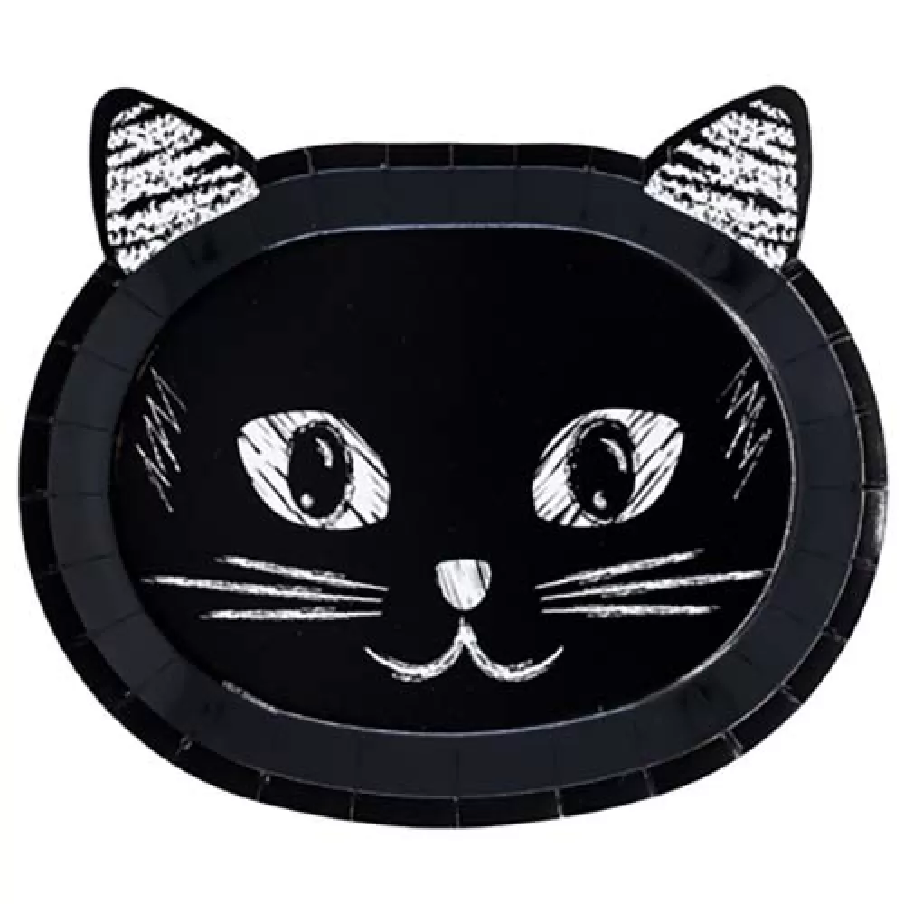 Одноразовые бумажные тарелки Котики в виде черных кошачьих мордочек с ушками.