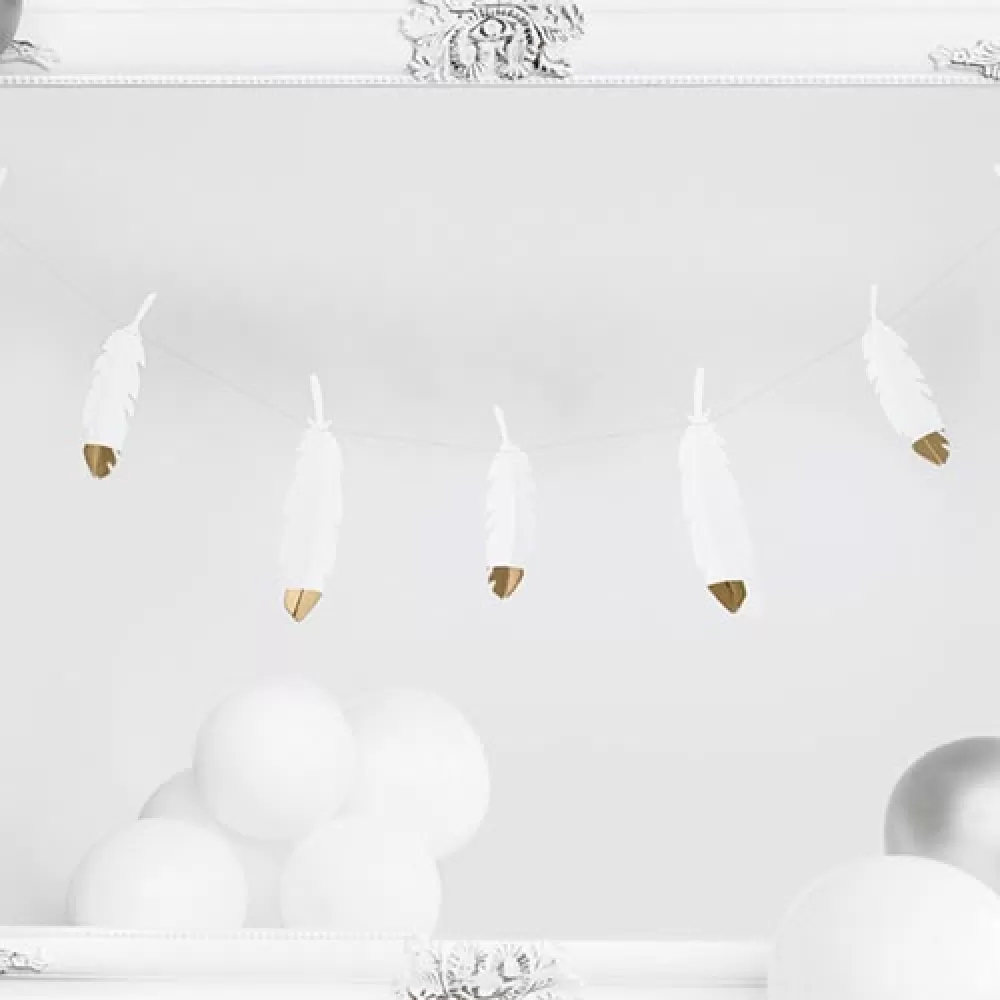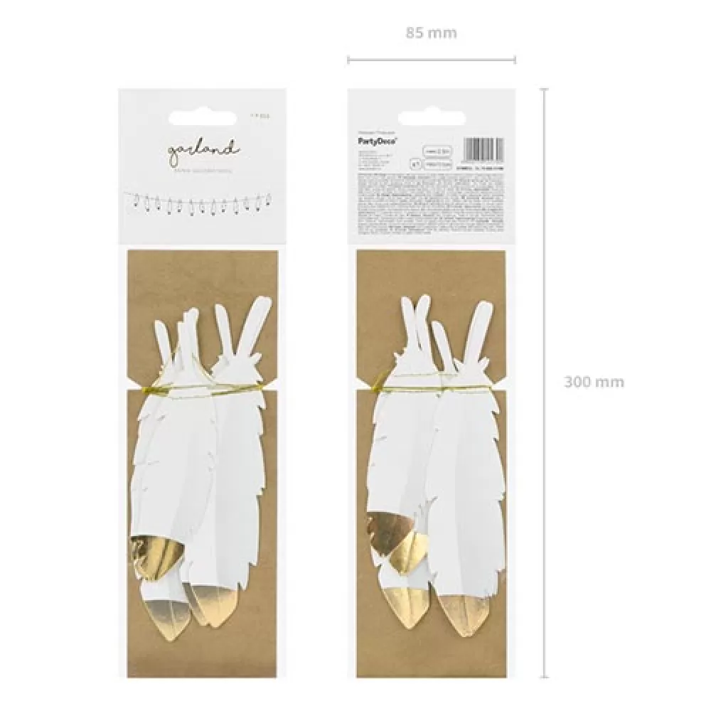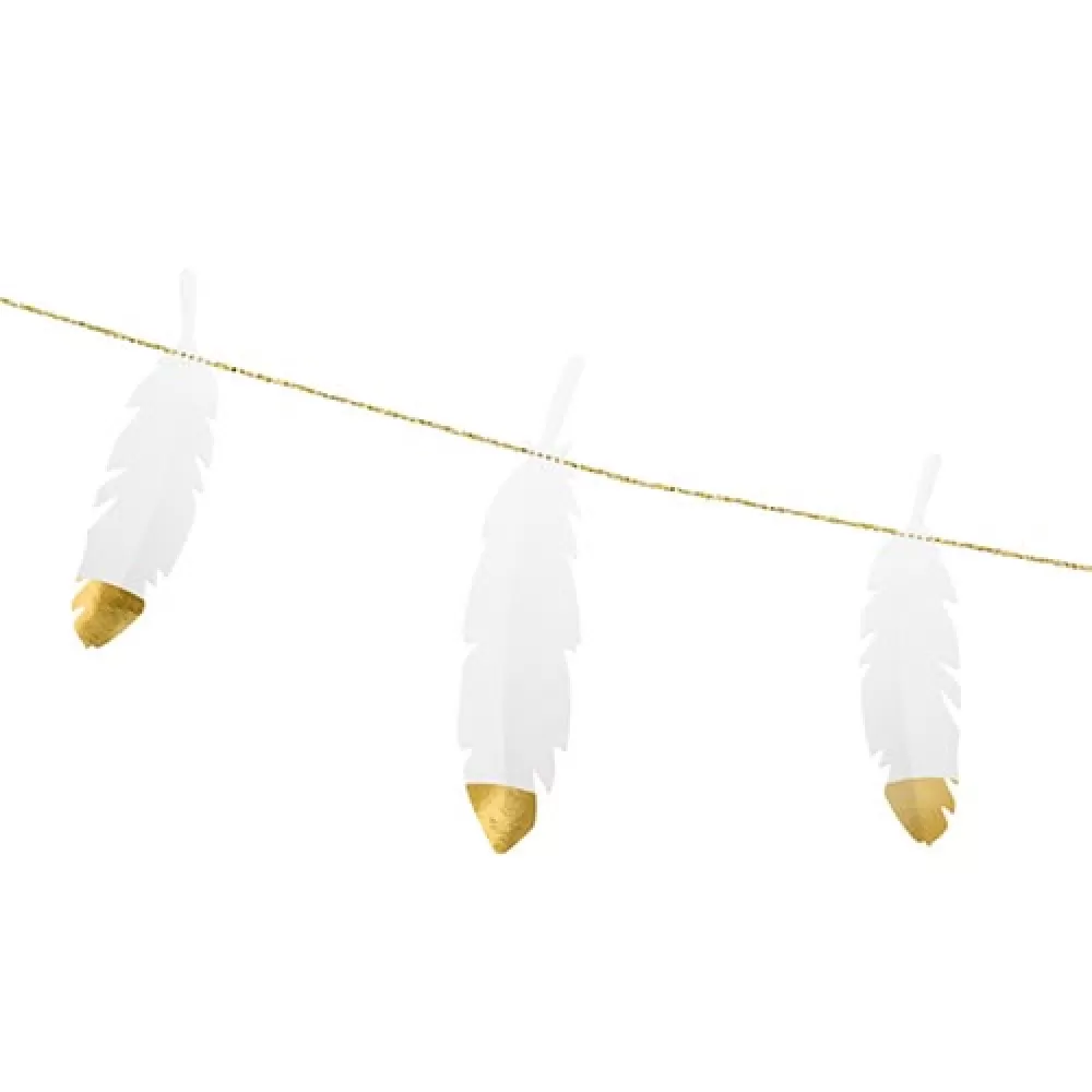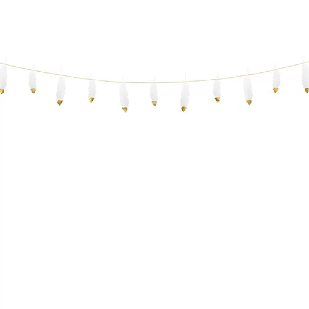 - Гирлянда Перья, белые бумажные перья с золотым кончиком на ленте.