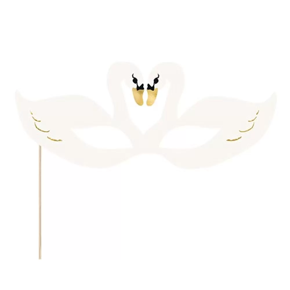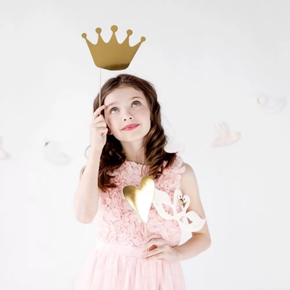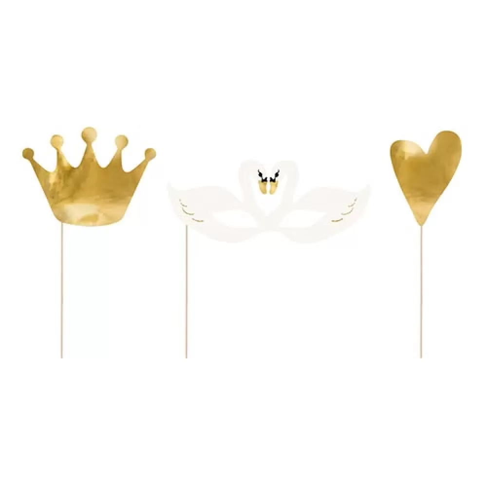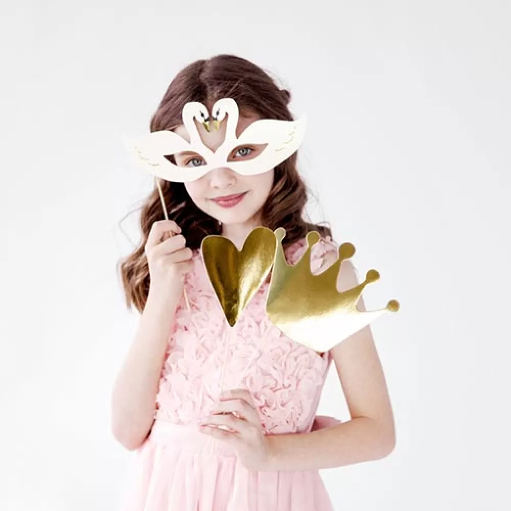 - Набор для фото Лебединое озеро: золотая корона, маска Лебеди и золотое сердце на деревянных шпажках.