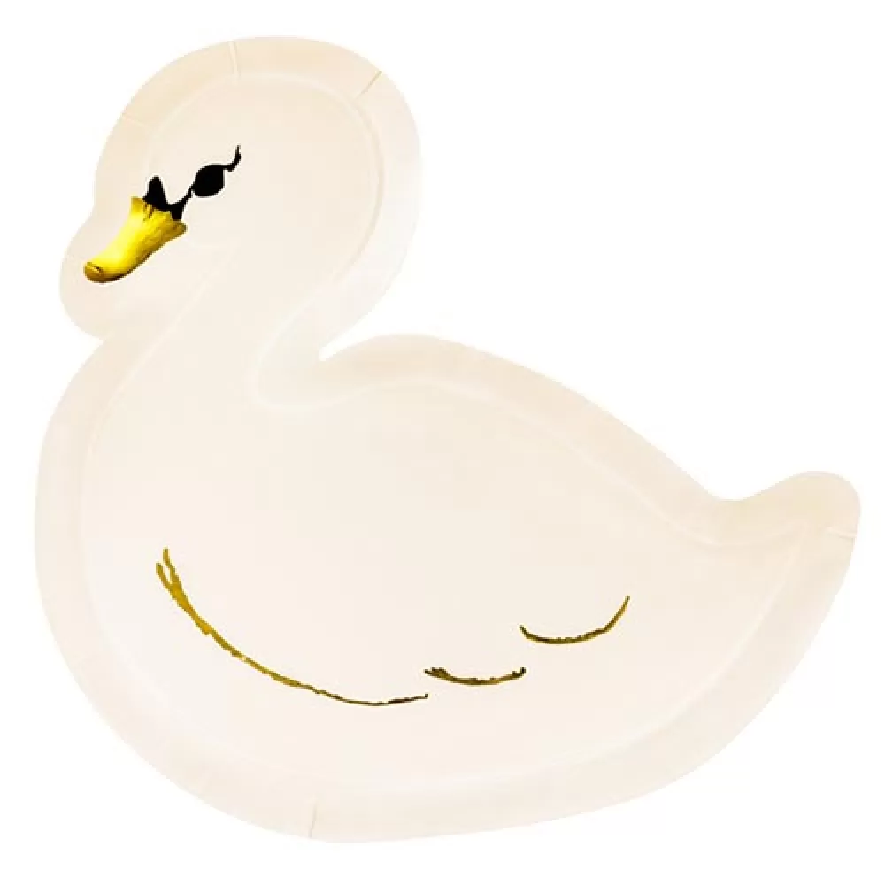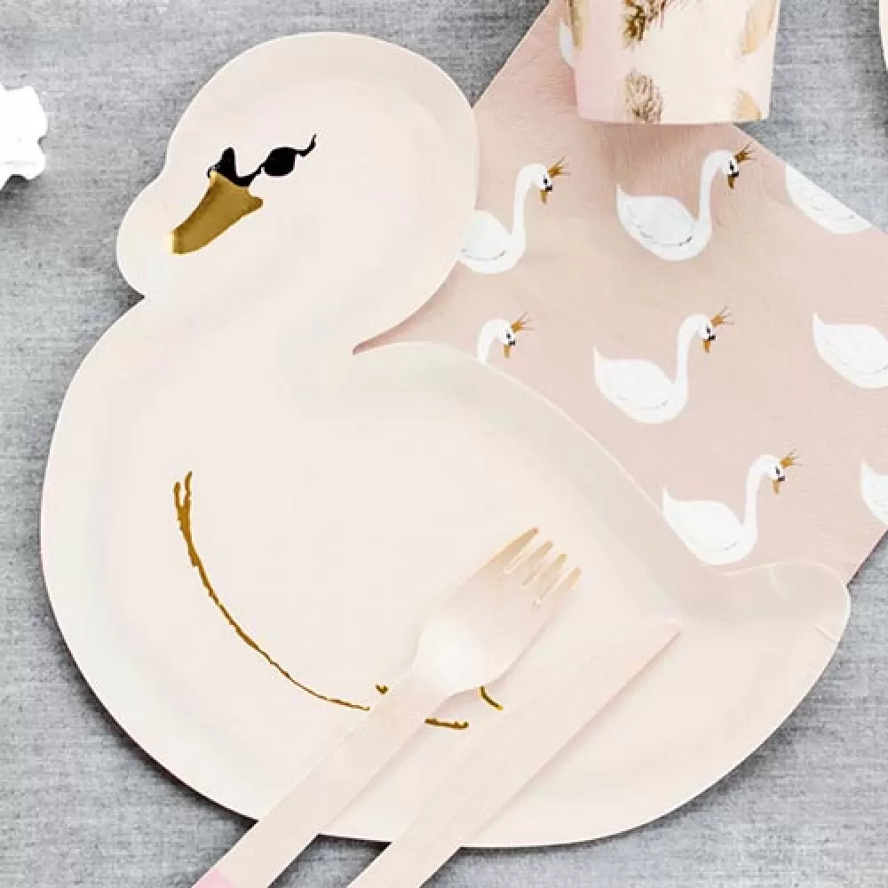- Одноразовые бумажные тарелки Лебеди в виде фигуры лебедя в пудрово-бежевой гамме с золотым тиснением.