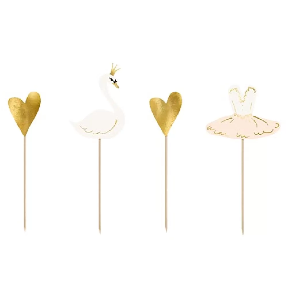 - Топперы Лебединое озеро на деревянных шпажках: пачка балерины, лебедь с золотой короной и сердце (2 шт.).