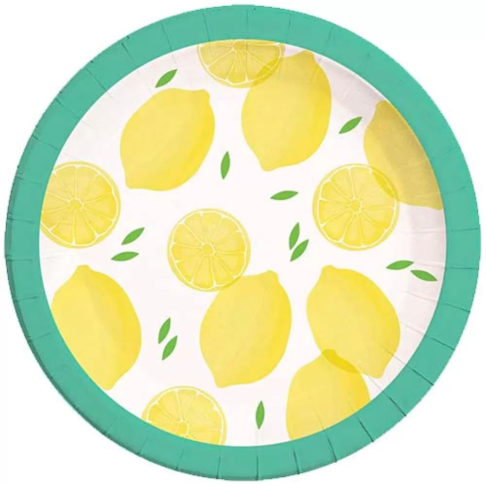 - Тарелки одноразовые бумажные Лимоны диаметром 23 см, с сочными лимонами и лимонными листиками.