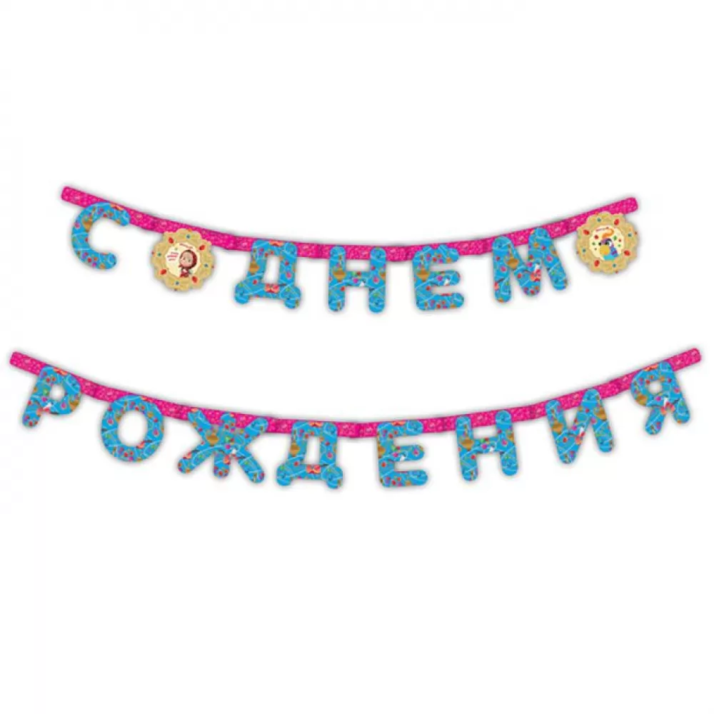 - Гирлянда «Маша и Медведь» C Днем Рождения из бумаги, длина гирлянды 2,5 м, высота флажков 14 см.