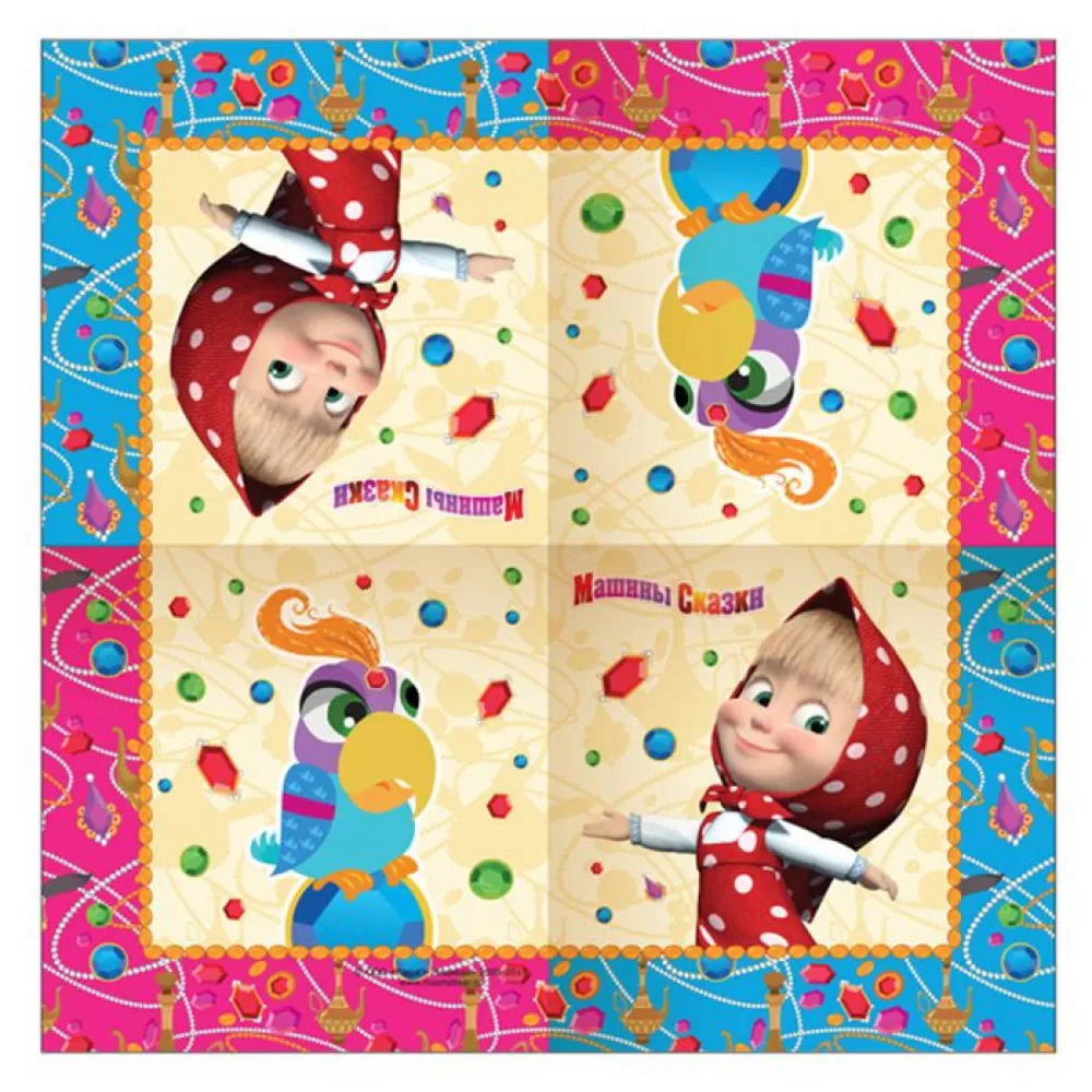 - Бумажные двухслойные салфетки «Маша и медведь» плотностью 18 gsm имеют размер 33х33 см.