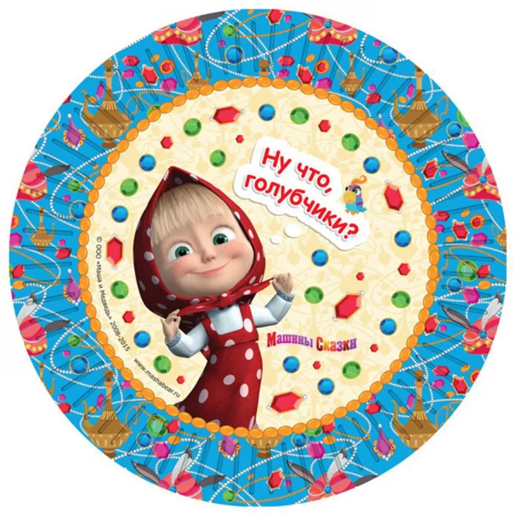 - Одноразовые тарелки «Маша и Медведь» (серия «Машины сказки»), в наборе 6 бумажных тарелок диаметром 23 см.