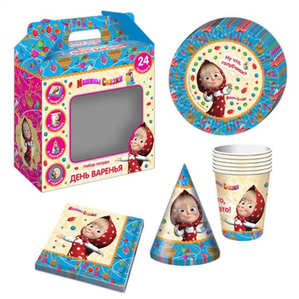 - В праздничный набор «Маша и медведь» входит 24 предмета на 6 персон - 6 тарелок диаметром 18 см, 6 стаканов объемом 210 мл, 6 бумажных колпачков на резинках, 6 бумажных салфеток из коллекции «Машины сказки».