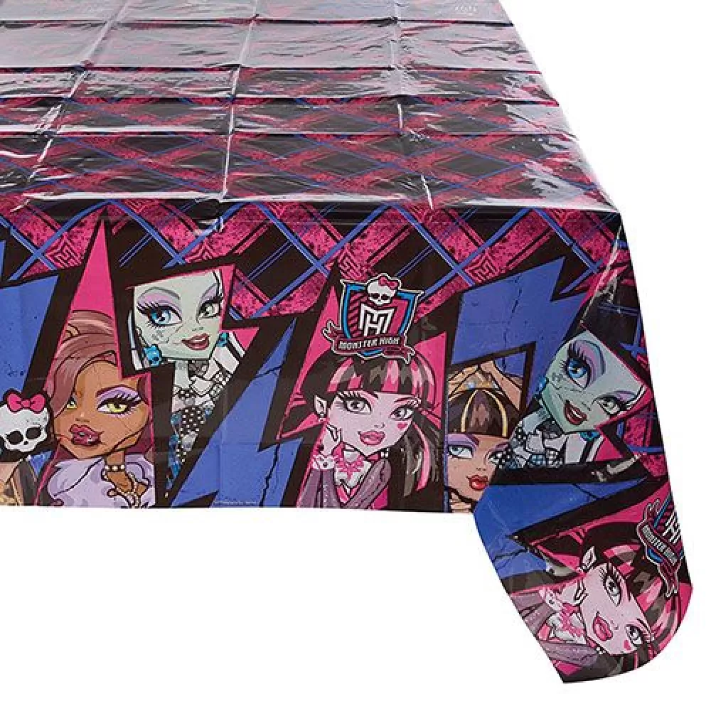 - Полиэтиленовая скатерть «Монстр Хай» с прекрасными Фрэнки Штейн, Дракулаурой, Клодиной Вульф, Лагуной Блю и Гулией Йелпс имеет размер 120х180 см. Серединка скатерти цветная, основной рисунок расположен на канве, чтобы не затмевать собой посуду.