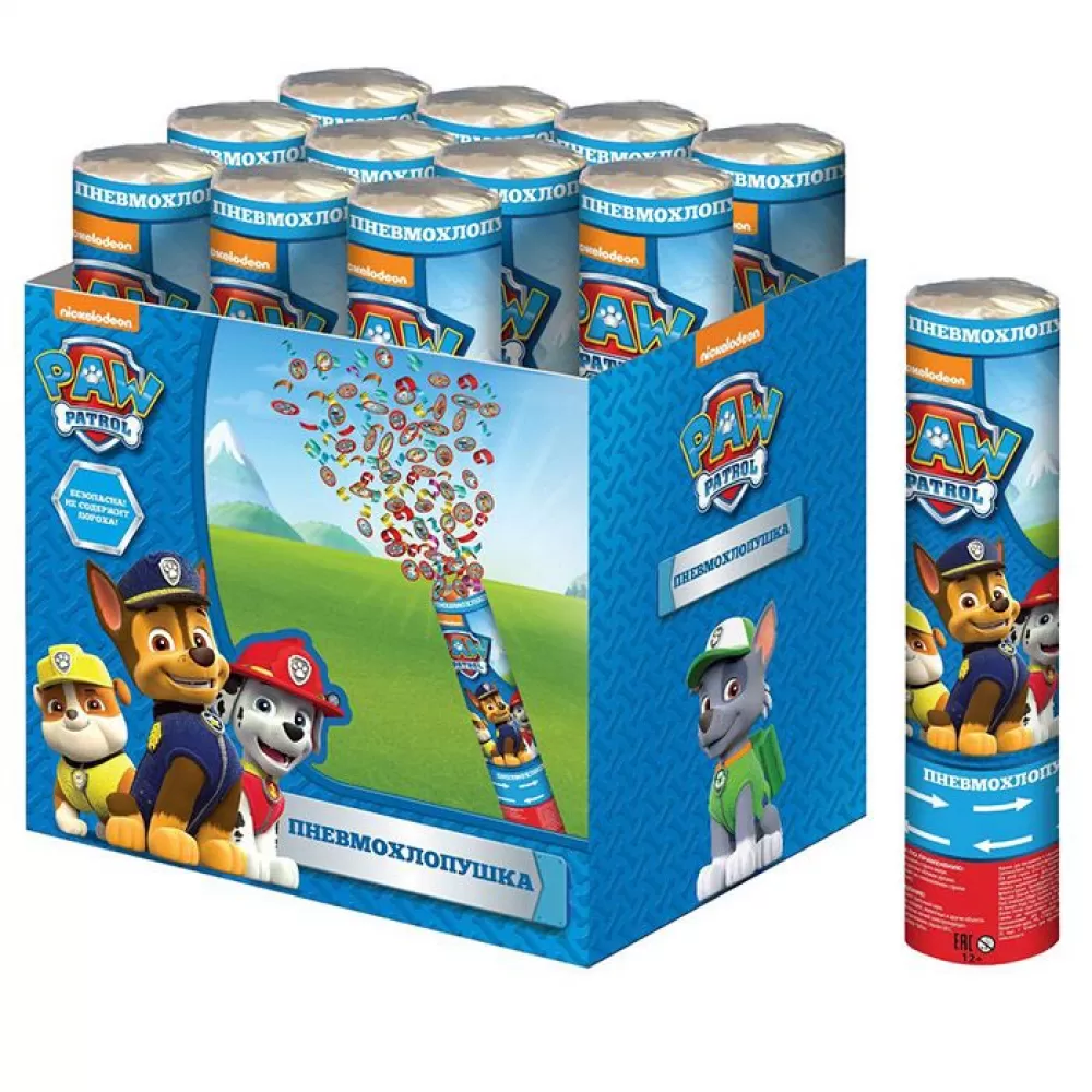 - Пневмохлопушка «Щенячий патруль» высотой 30 см, наполнение - конфетти круглой формы с изображением героев мультфильма.
