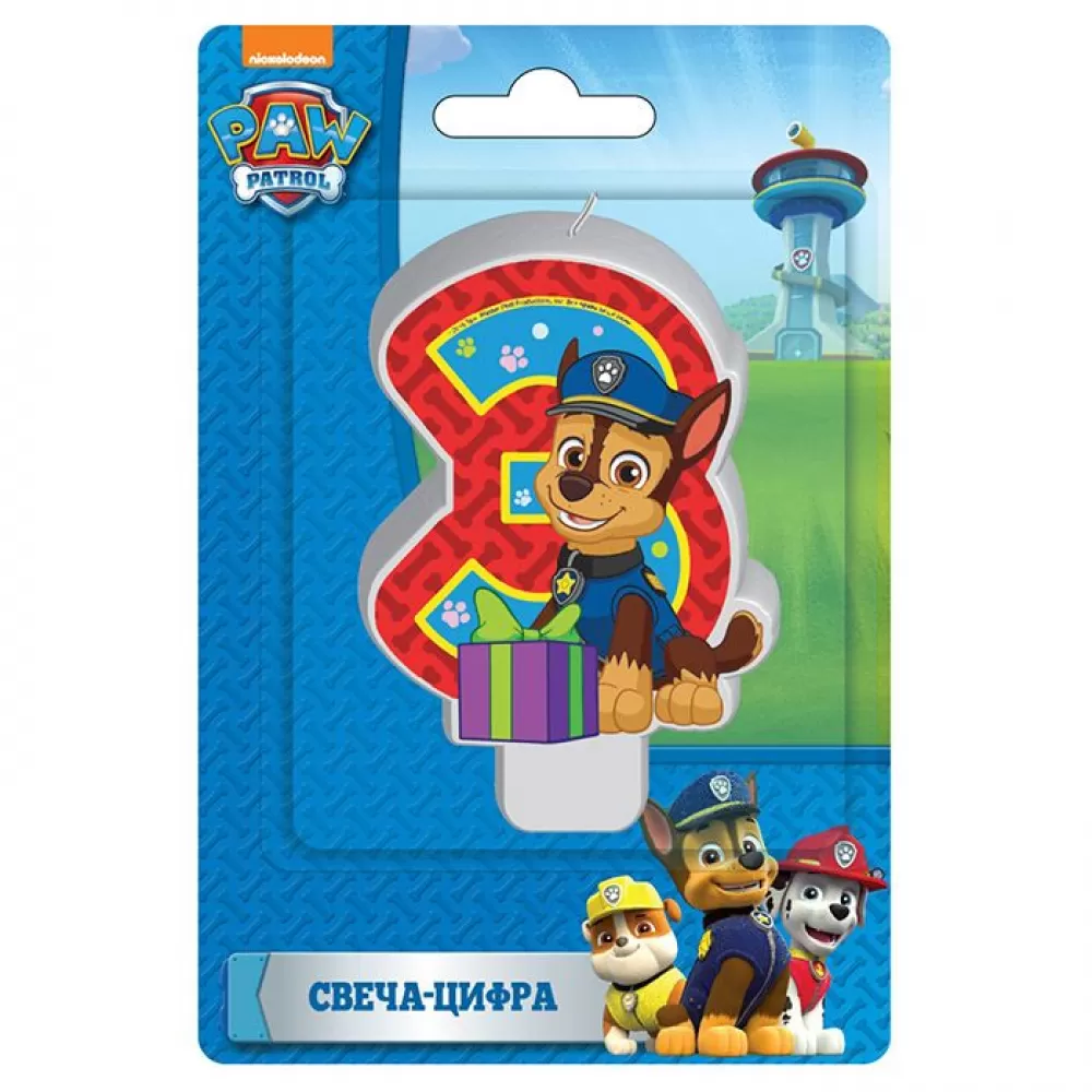 - Свеча 3 «Щенячий патруль» отлично дополнит красивый праздничный торт.