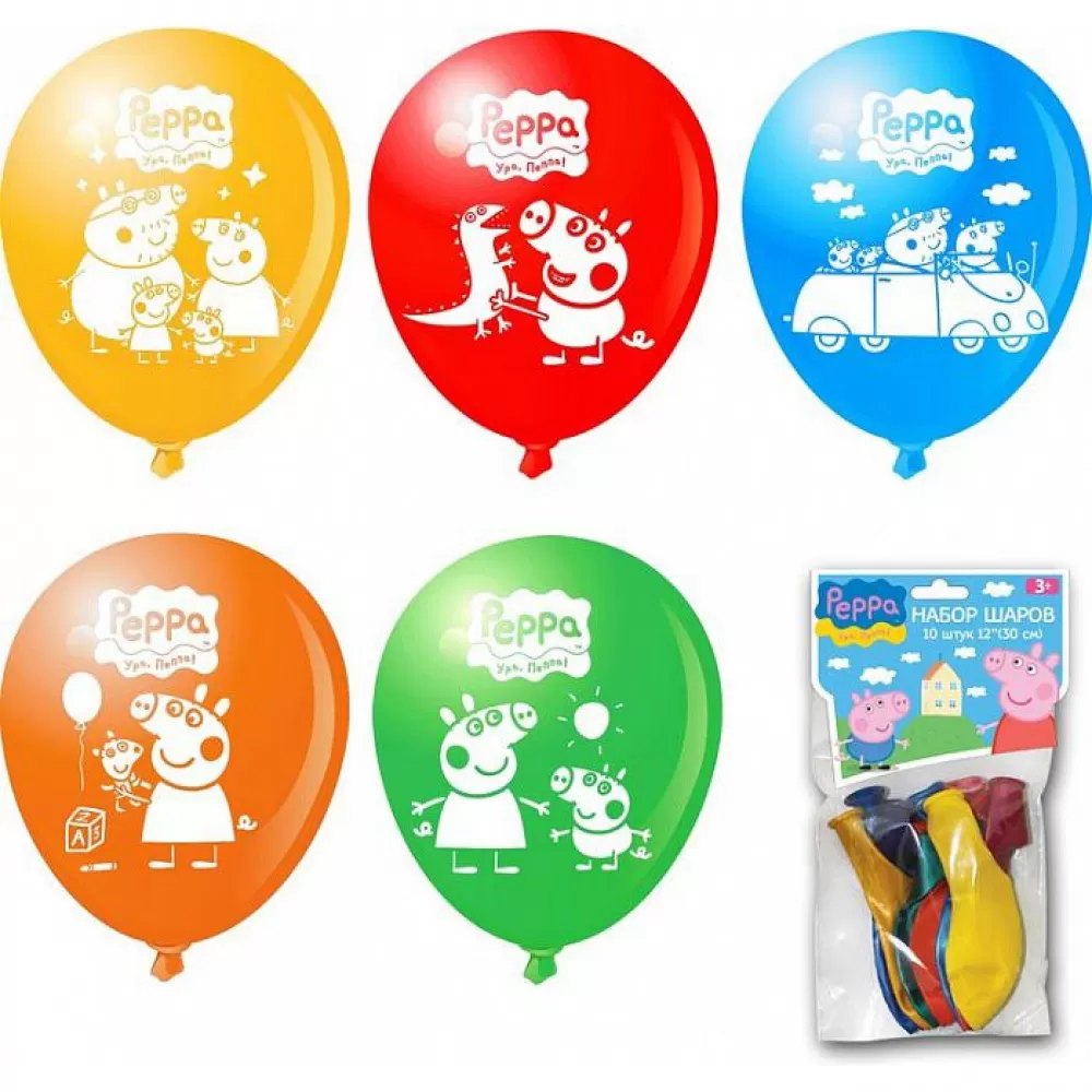 - В наборе Peppa Pig 10 надувных шаров из латекса диаметром 30 см с односторонней печатью.